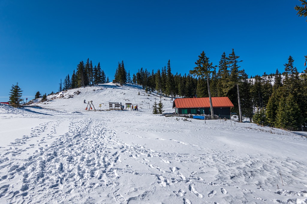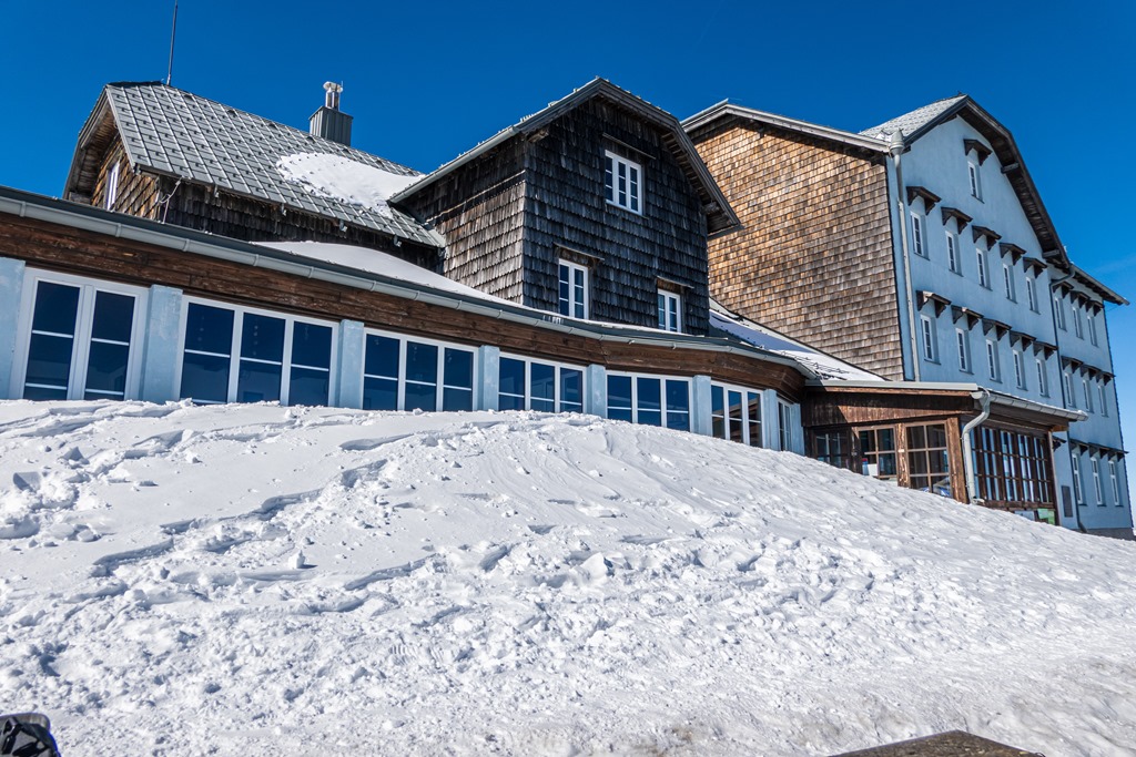 Az Otthaus mögött több kitaposott nyom is hívogat a csúcs irányában. Érdekes, valamennyi a törpefenyők hegyén. Aki nem tudja, nem is sejti, hogy legalább kétméteres hóréteg borítja a hegyoldalt.