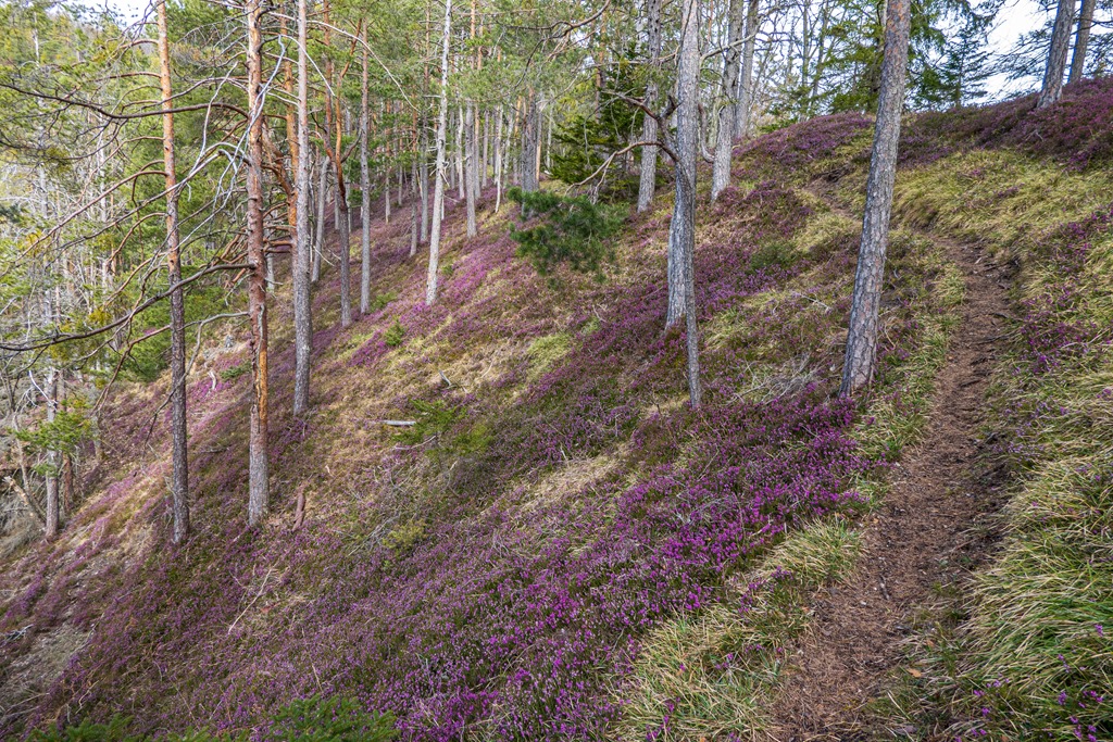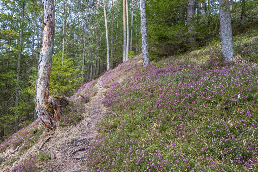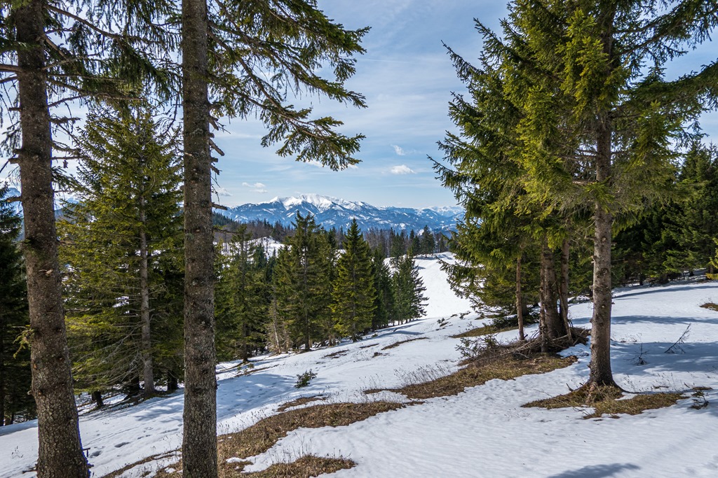 Odalenn Hohenberg temploma elejében, ahol leparkolok, elkendőzhetetlen a tavasz, hónak nyoma sincs a környező dombokon. Vagyok tehát olyan otrombán gyanútlan, hogy a hótalpaimat a csomagtartóban hagyom. Ez eleinte úgy tűnik, hogy jó ötlet, mert amerre megyek, csupa lila tavaszi virágszőnyeg borítja a lankákat (lenti kép). A tél itt már régen kimúlt. Miféle badarság is lett volna hótalpakat cipelnem magammal! Aztán nesze neked! Egy sziklaszirtről belátható a Gschwendthütte feletti fehéren ragyogó hegyoldal (fenti képek), ami rosszat sejtet.