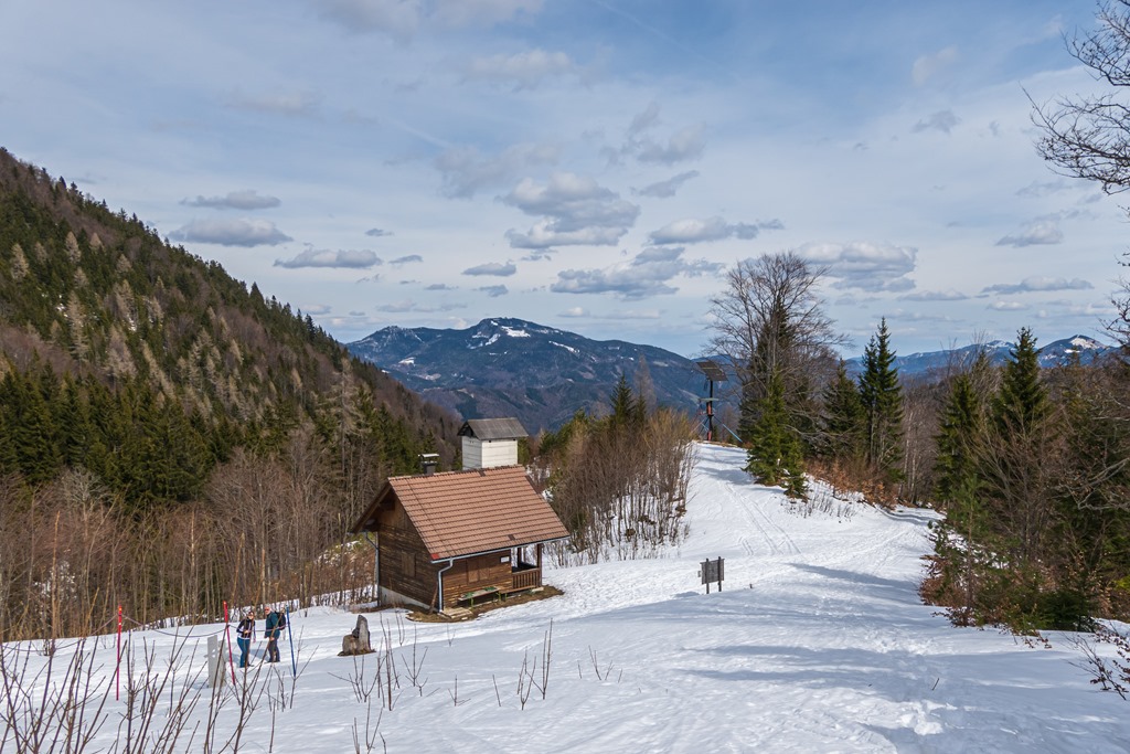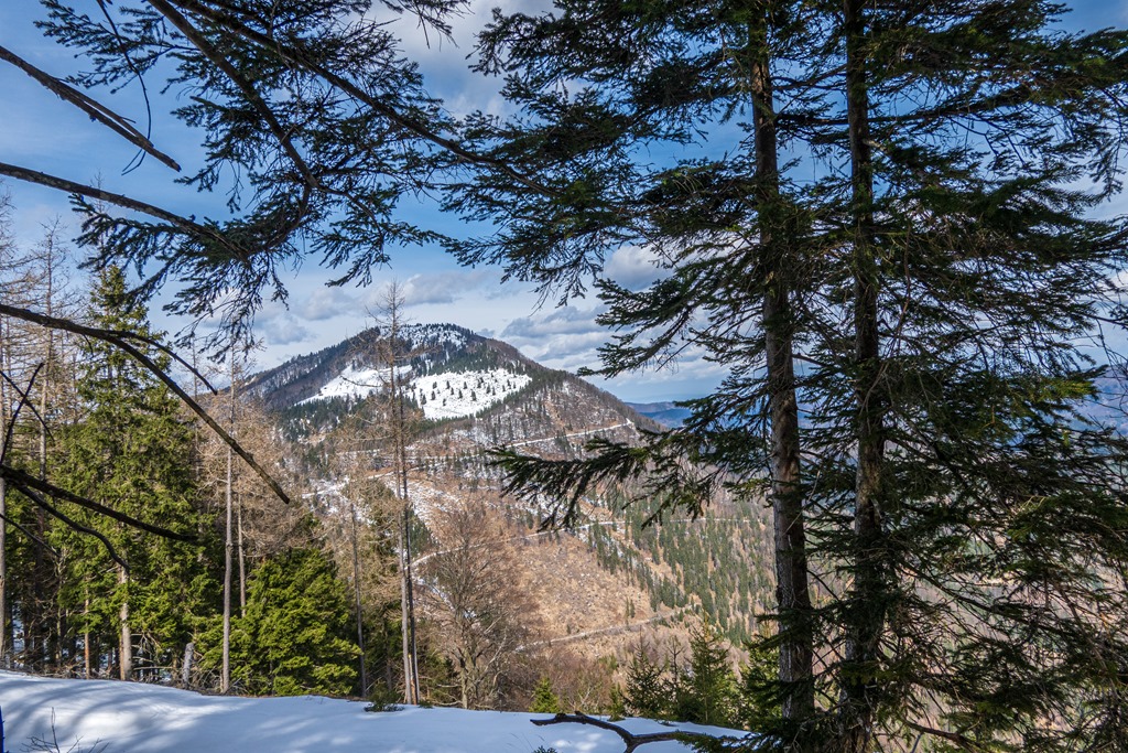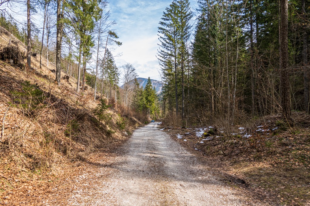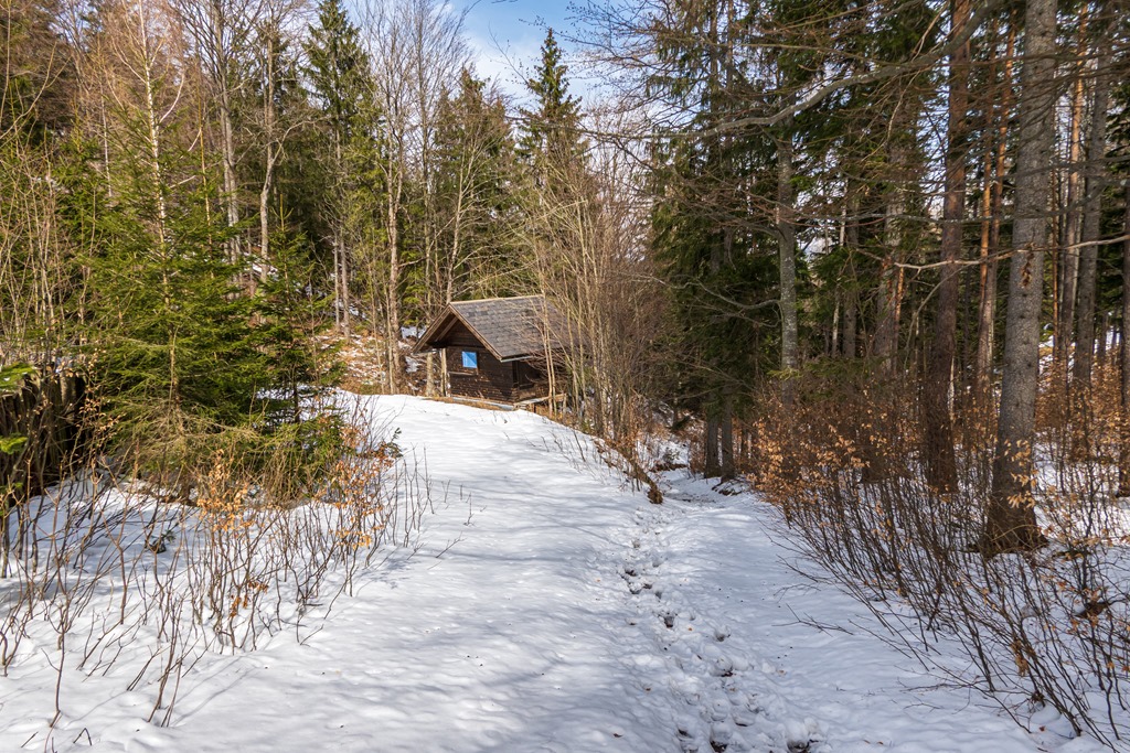 A lágyra olvadt hó hamarosan elfogy. Kiérek a széles erdészeti útra, miután már csak enyhén lejt a terep (fenti kép). Elhaladok a Bilinsky-forrás mellett (lenti kép), majd a helyi temető mellett beérek Hohenbergbe. Szép, élvezetes, tanulságos kirándulás volt. Hányszor megmondtam pedig már neked, hogy ne légy rest a hótalpakat magaddal vinni.