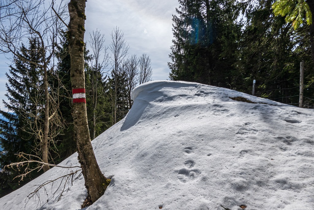 Amikor elérem a rendes turistaút vonalát, eldönthetem, merre menjek. Jobbra a Högerre, vagy balra a Linsberg/Paulmauer felé. Ahogy elnézem, sem a Höger felé, sem pedig az ellenkező irányban nincsenek nyomok. Az egy héttel ezelőtti hóesés óta, az első erre tévedt vándor lehetek.