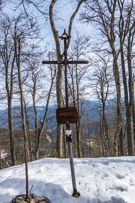 És feltehetően jól döntöttem, mert a viszonylag rövid szakasz a Linsbergig sem akármi. Egy csomó, szél építette hóbuckán át bukdácsolok a szó szoros értelmében. Szerencsére a nadrágom szárán van beépített gamásli, így elkerülhetem, hogy hóval teljen meg a bakancsom. Térdig, sőt azon túl is süppedek helyenként. Egyszóval kalandi vállalkozás még elérni a Linsberget. Gondolni sem akarok a további útig a Paulmauerre. Az új csúcskereszt, vasból, azaz rozsdás vasból van, amatőr munka, mégis kedvemre való (lenti kép).