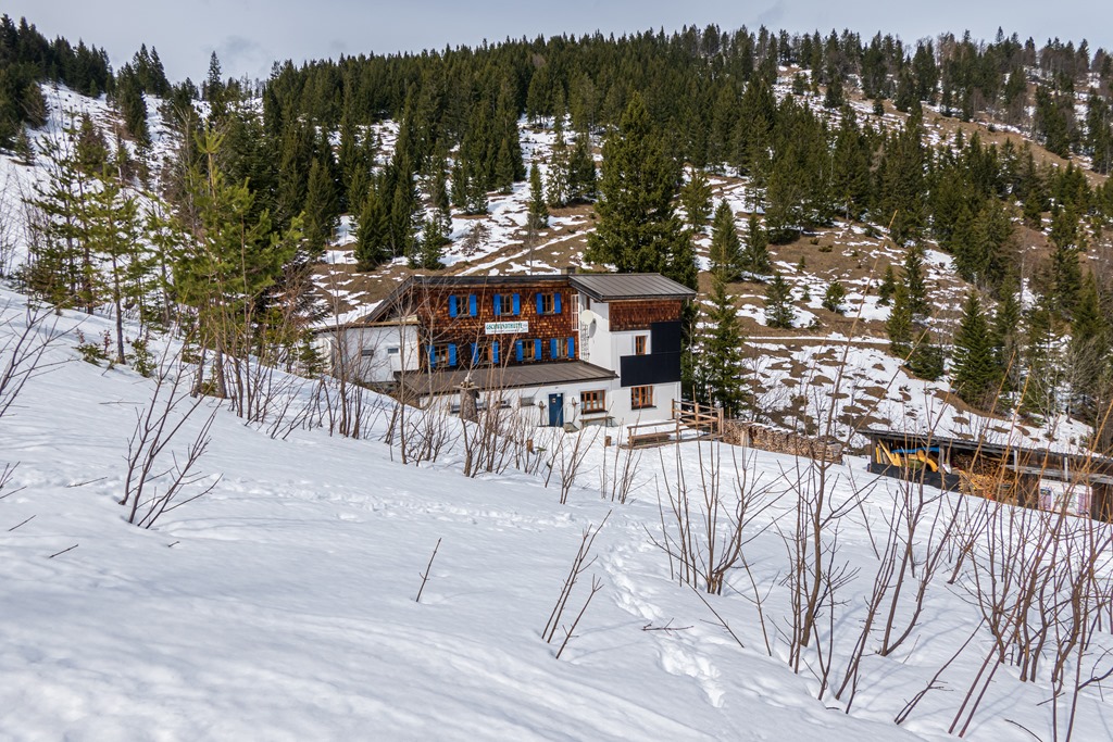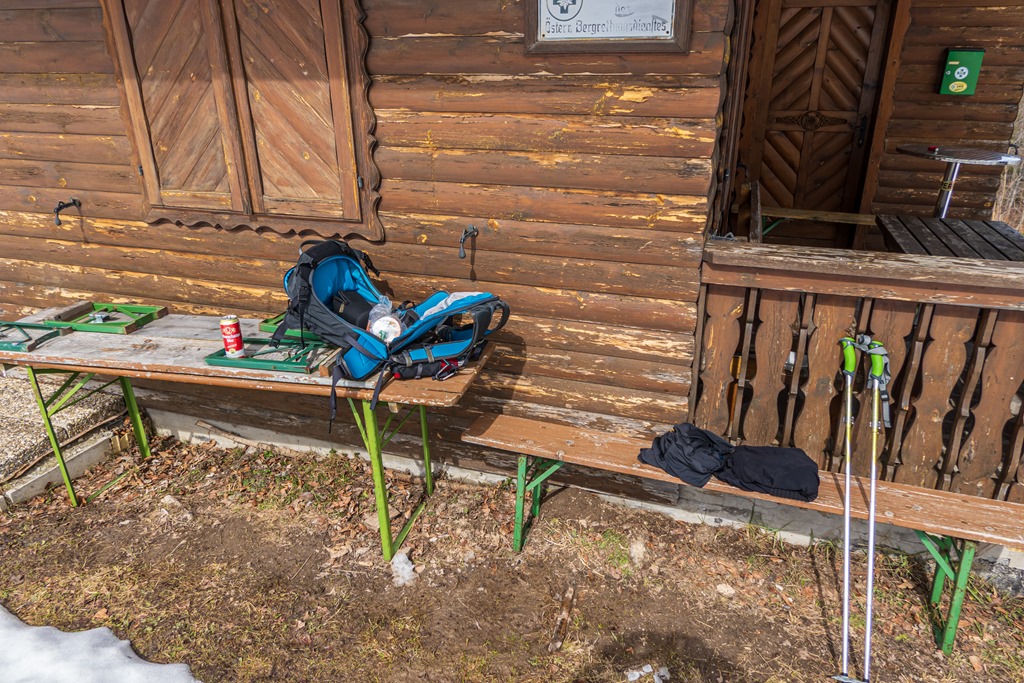 A Gschwendthütte tőszomszédságában a Hegyi Mentőszolgálat kunyhóját nézem ki déli pihenő helyemnek (fenti és lenti képek). Van itt a déli irányba tekintő fal mellé állítva két pad, azokon kicsomagolhatom a dolgaimat, átöltözhetek és a bágyadt napsütésben, széltől is óvva, átadhatom magam kulináris örömeim élvezetének. Remekül érzem magam. És továbbra sincs senki, sehol. Egyedül a természet lágy ölén, már-már giccses.