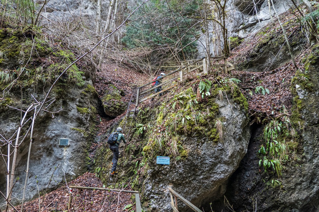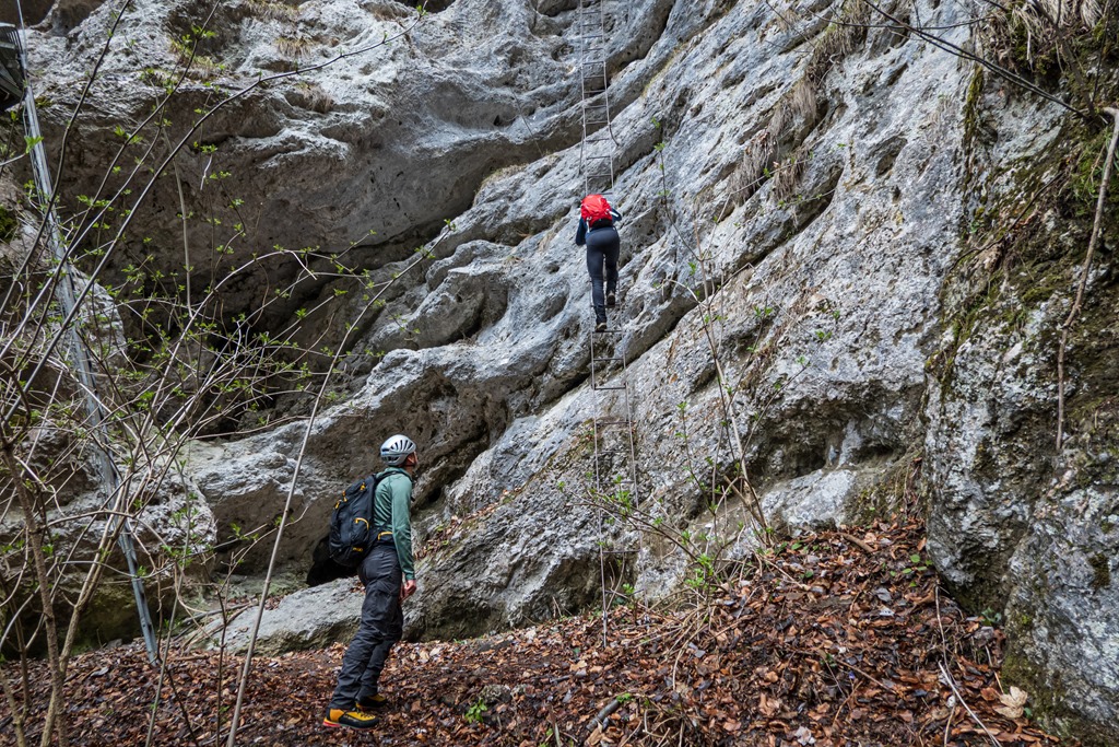 A szurdok közepén a meredekebb változat mentén, a Rudolf-Decker-Steigen folytatjuk (fenti és lenti képek), tudniillik az„égigérő” függőleges vaslétrán fel. Rövid, de vadromantikus sziklavilág, jó alapot nyújtó kezdet. A magántulajdonban lévő terep tulajdonosa érdekes útmutató táblákat állíttatott fel, mely alapján nyilvánvaló, mekkora „lelkesedéssel” viseli az esztelen megszorításokat.