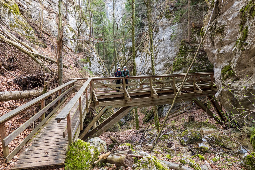 Kilenc óra lehet, amikor nekiveselkedünk a Kőszikla-szurdoknak (Steinwandklamm). A belépő fizetős, ami nem gond, hisz a szurdokban vezető pallózat rendszeres karbantartást igényel. Eme segédletek nélkül, teljességgel átjárhatatlan lenne, legalábbis a közönséges halandók számára.