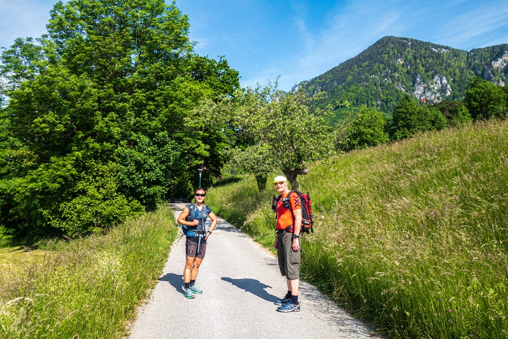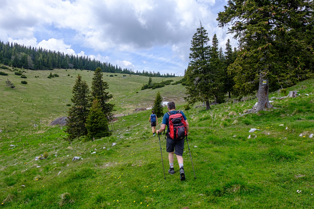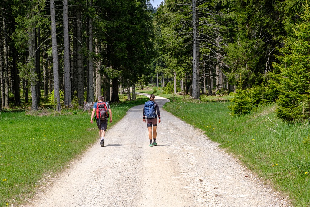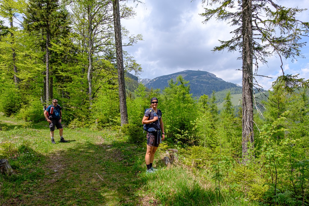 A túra második része a füves platón, jobbára széles erdészeti utakon visz Alpleckig. Hamarosan ismét felragyog a nap, és csitul a korábban még csiklandozó hűvös szellő is. A vidék, amerre sétálunk, majdnem teljesen sík, amit csak hébe-hóba szakítanak meg kisebb-nagyobb kiemelkedések. Alplecknél, ahol beúszik a képbe őfensége a Schneeberg is, azonban vége szakad a gyenge kis poroszkálásnak, ami a második részre teszi rá a pontot, mert kőkemény kaptatók láncolata következik.
