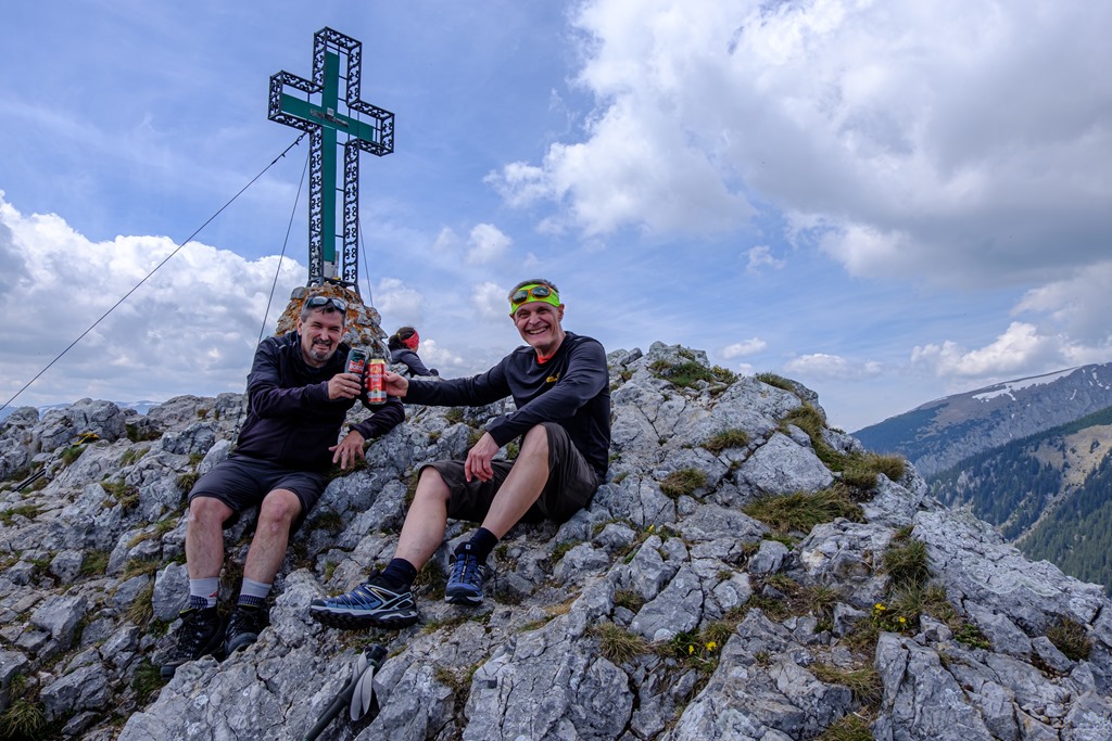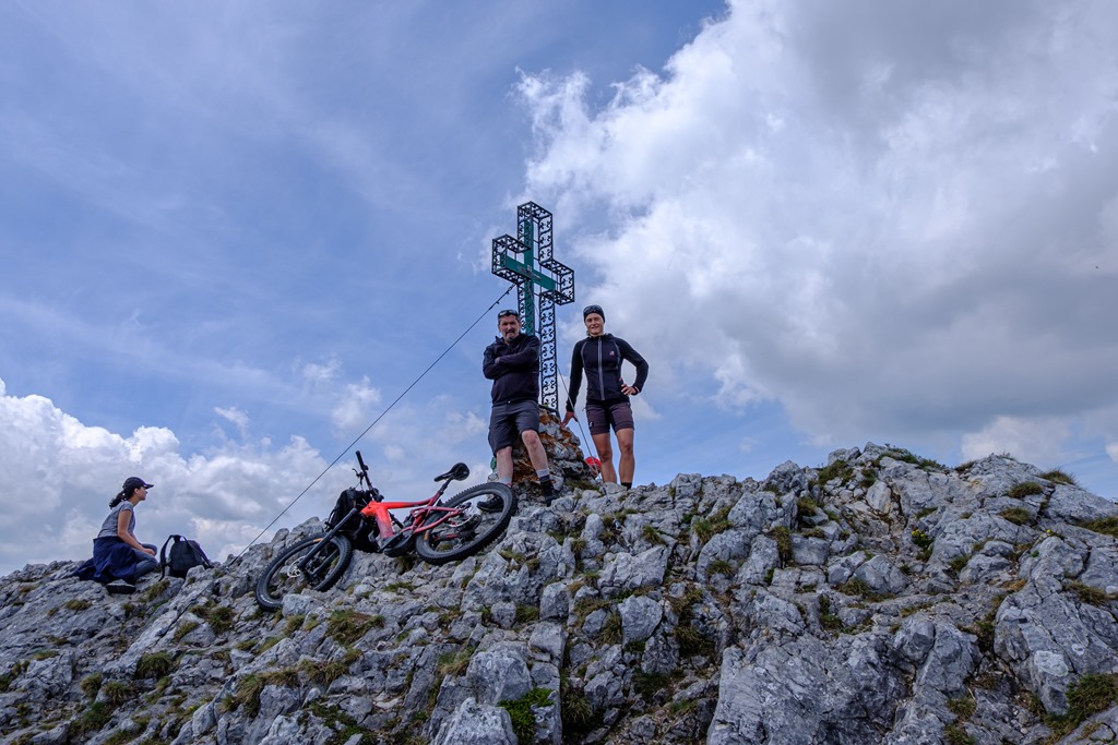 A harmadik rész tehát maga a csúcsostrom. Ez annyira igénybe veszi testi-fizikai képességeinket, annyira összpontosítunk a feladatunkra, hogy a korábban még élénk beszélgetés fonala is teljesen megszakad. Ama Csikszentmihályi-féle flow állapotában érjük el az elhagyatottnak látszó Alplalmot. Imitt-amott még hófoltok is virítanak. Egy törpefenyő utcácska vezet a Krummbachstein sziklás felépítésű csúcsa tövébe. Bő négy óra elteltével, valamivel fél kettő (13:25) előtt érjük el a csúcskeresztet. Odafenn élénk a látogatók mozgása. Valaki még villanybiciklivel is felmerészkedik, bár láttuk, a csúcsra csak tolta a bringáját. Naná! Az ösvény meredeksége kizárja, hogy oda bárki is feljusson két keréken.