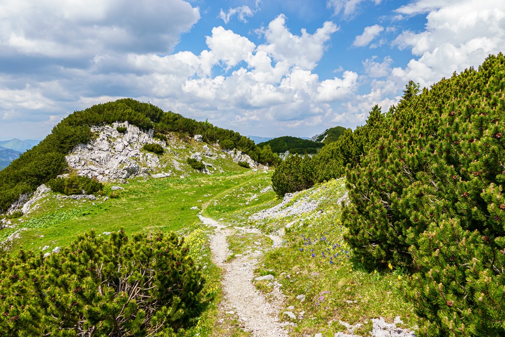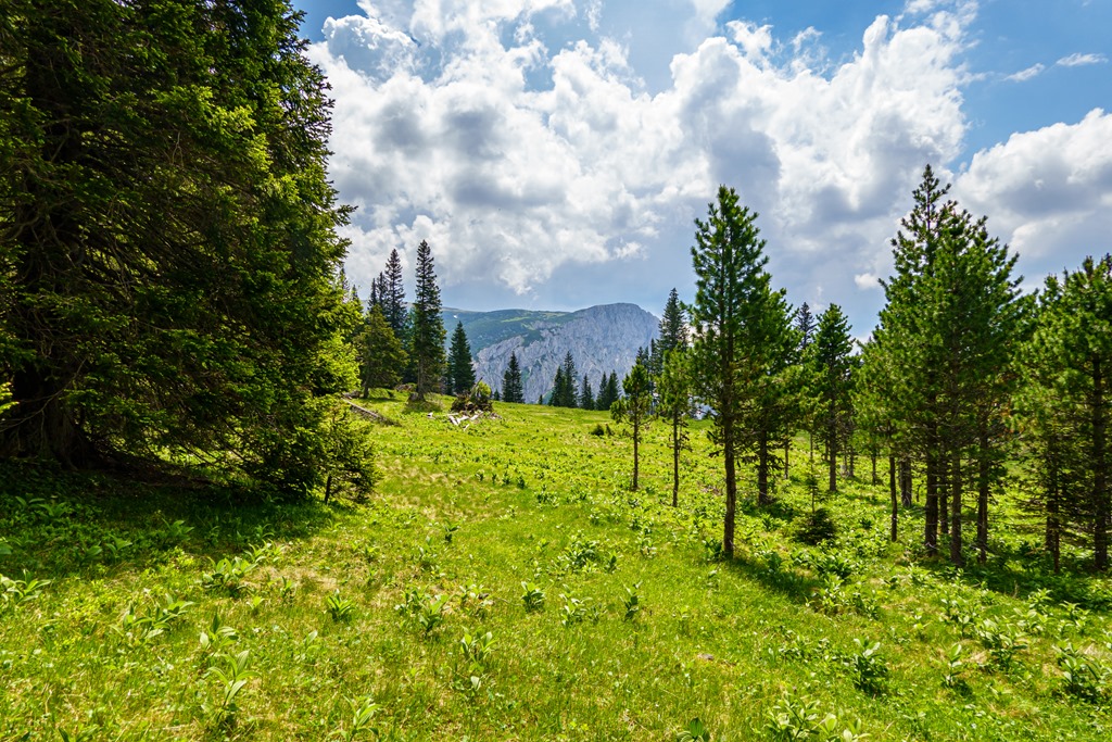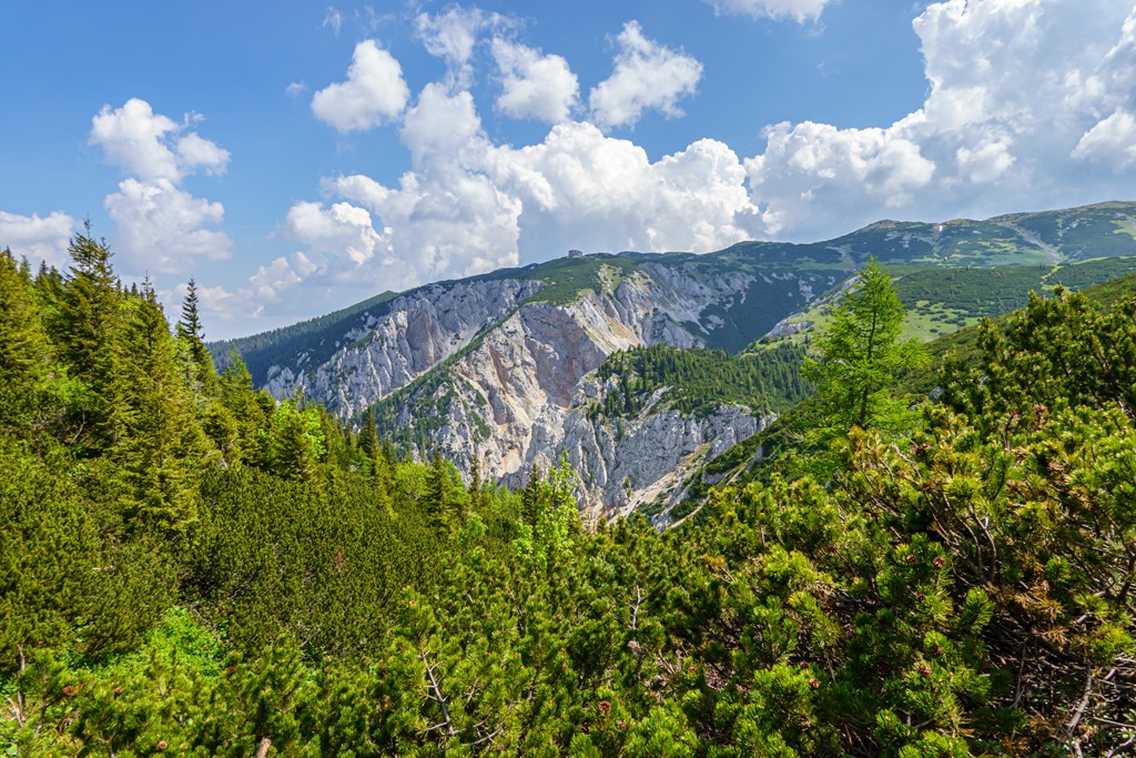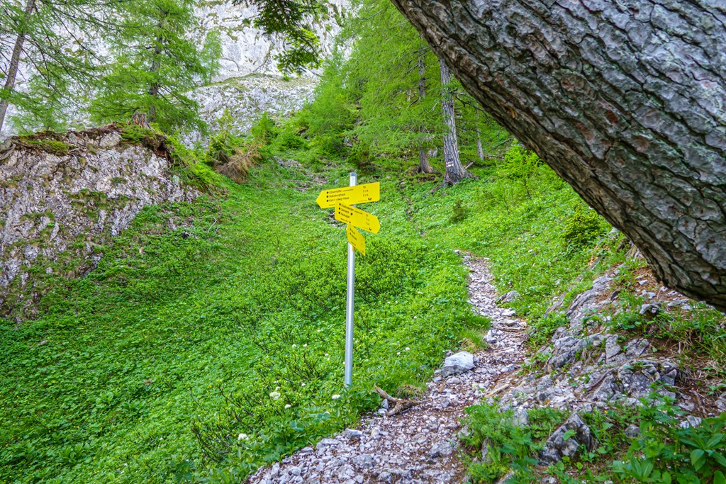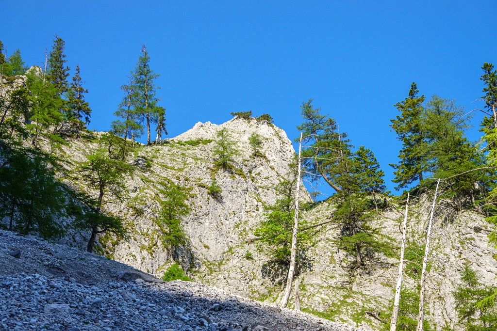 Megcsodálok egy ritkaságszámba menő enciánmezőt, majd a Kaisersteigen ballagok lefelé. Az ösvény még most is a két évvel ezelőtti iszonyú vihar okozta sebeit viseli. 14:20 van, amikor kiérek a széles Reisstaler-Wegnek titulált erdészeti útra (semmi köze a Reisstalerstighez), amin jó egy órás séta visz vissza a kiindulópontomba. Remek és változatos túra, melyet mintha kifejezetten kánikulai útvonalnak találtak volna ki. Na persze csak akkor, ha reggel indul valaki és nem délben, mint ama velem szembejövő fickó meséli nekem, akivel a Habsburgház teherliftje völgyi állomásánál elegyedek szóba.