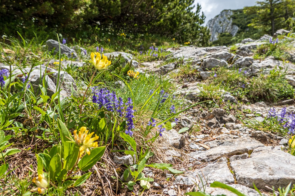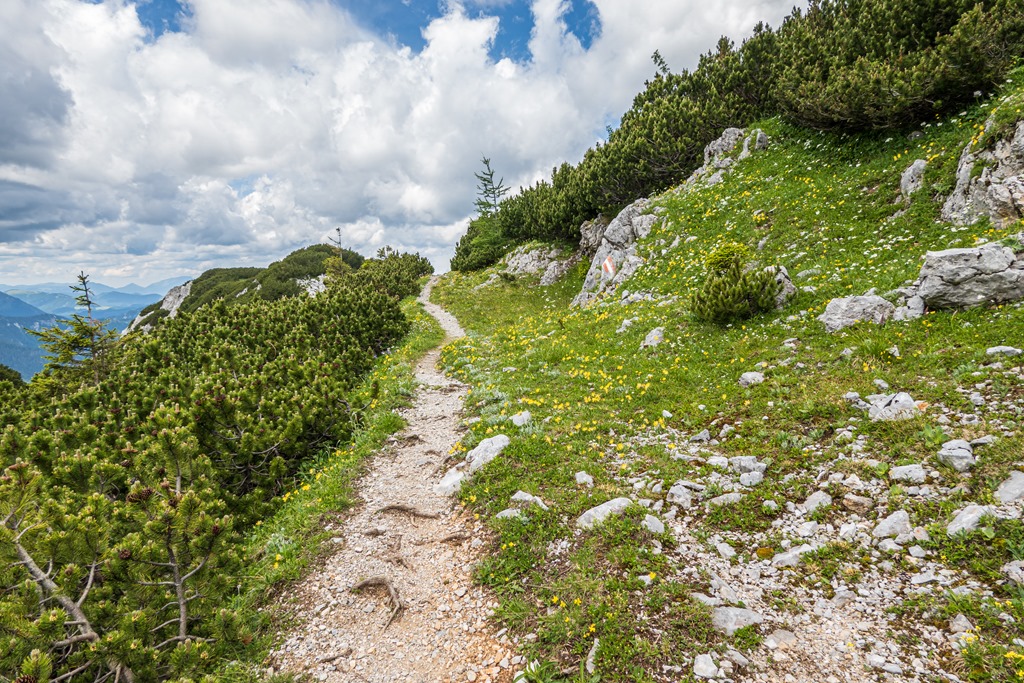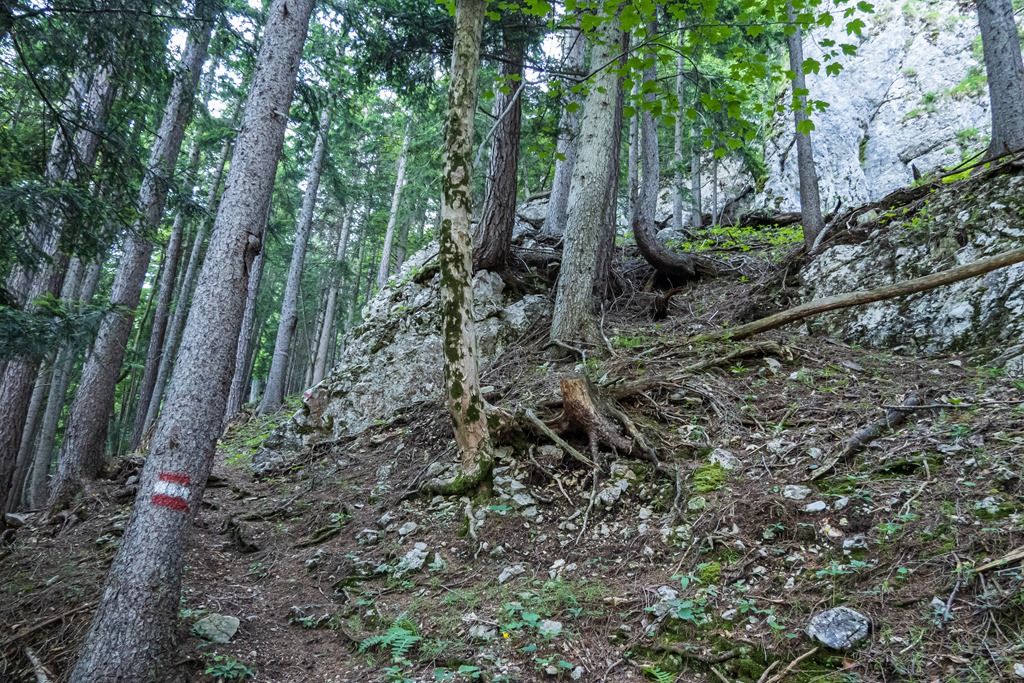 Hát bizony egy idő után keservessé válik az egyhangú menetelés a Schüttersteig platón vezető, unalmas, kilátástól fosztott részén. Igaz, valamelyest javul a terep állaga, amikor az út vonala elhagyja a széles, sziklamorzsalékkal szórt utat, és erdőben, sűrű aljnövényzeten át bukdácsol a fennsík széle felé.