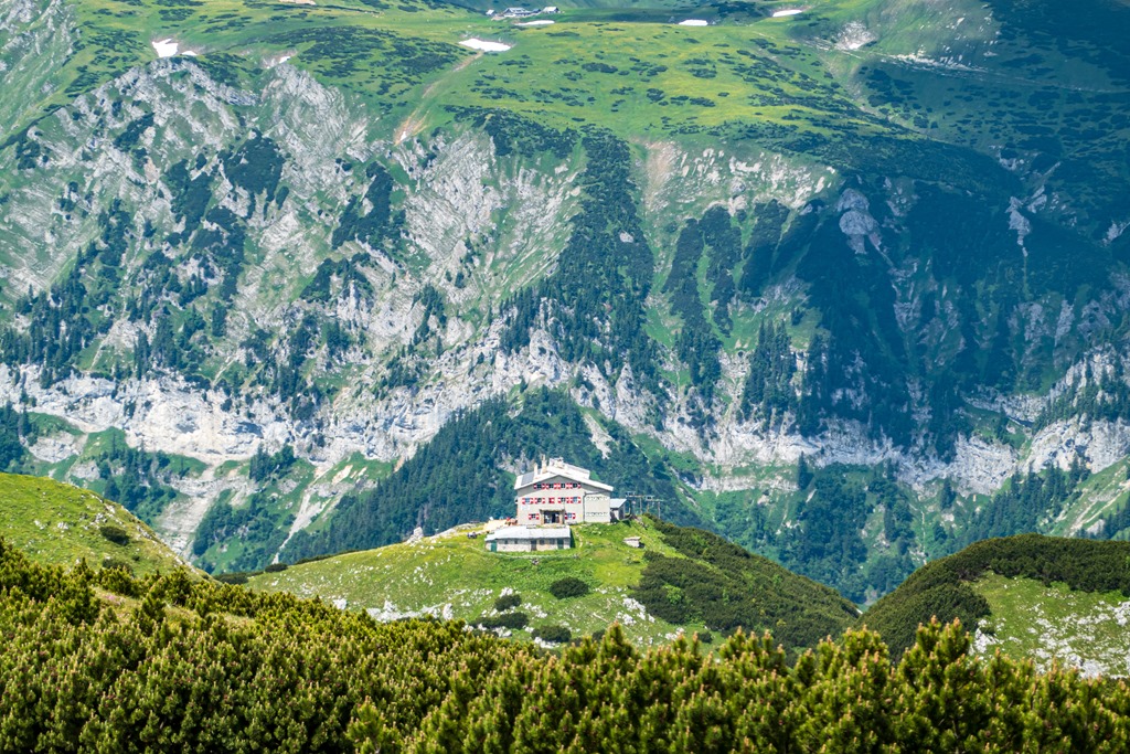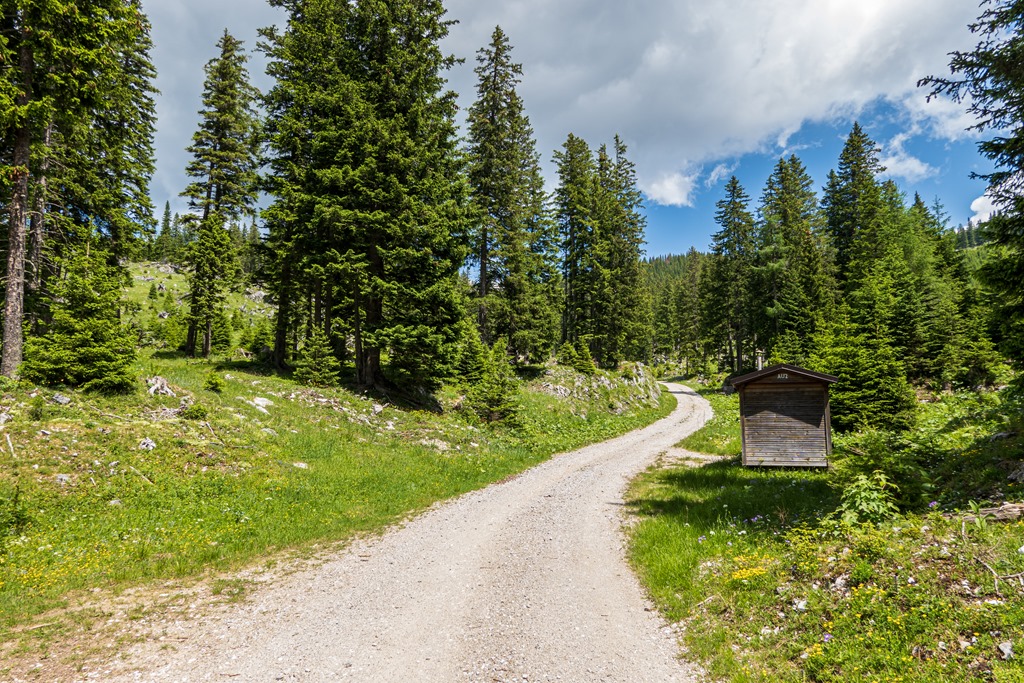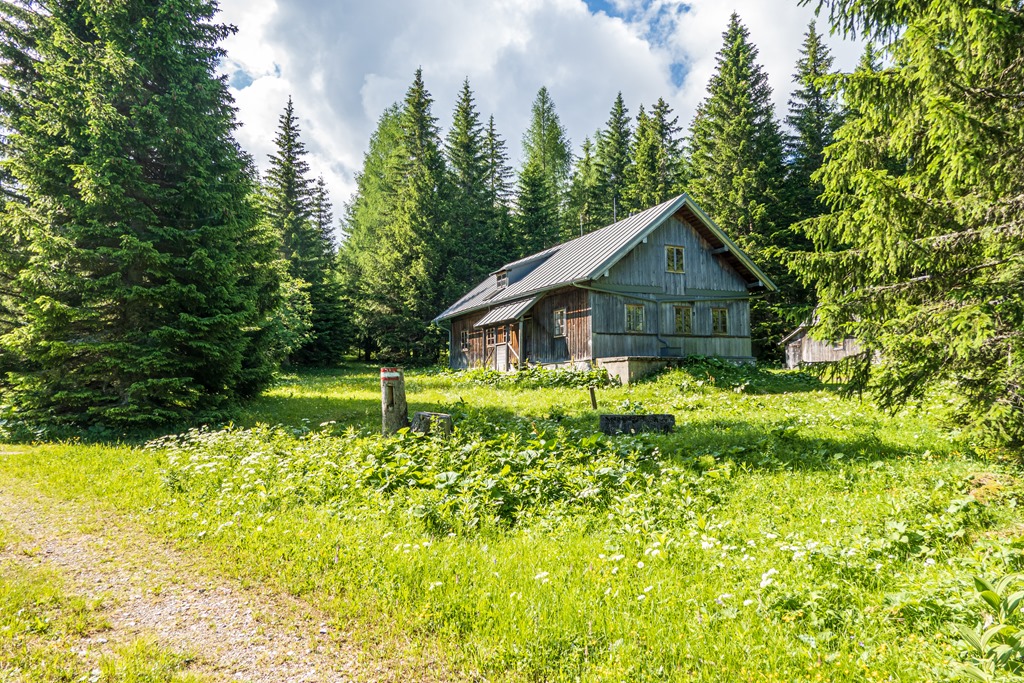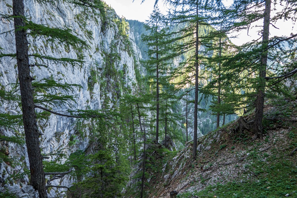 Bő egy óra alatt érem el a napsütötte platót. Széles erdészeti úton haladhatok tovább, egészen a Großer Kesselgrabenig, ahol ismét kaptatósba vált a terep. Úgy 1550 méter szinten a Gloggnitzerhütte tövében lyukad ki az erdőből. Látom a gazdasszonyok vendégváró sürgölődésben vannak a kunyhó körül. Én úgysem vehetném igénybe szolgálataikat, így hát előveszem Chia-csodaitalomat, kortyolgatok belőle nagyokat, és menten tovább is állok. A terep az erdőhatár fölé visz.