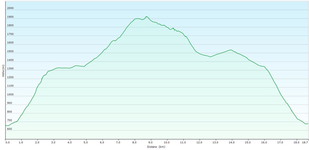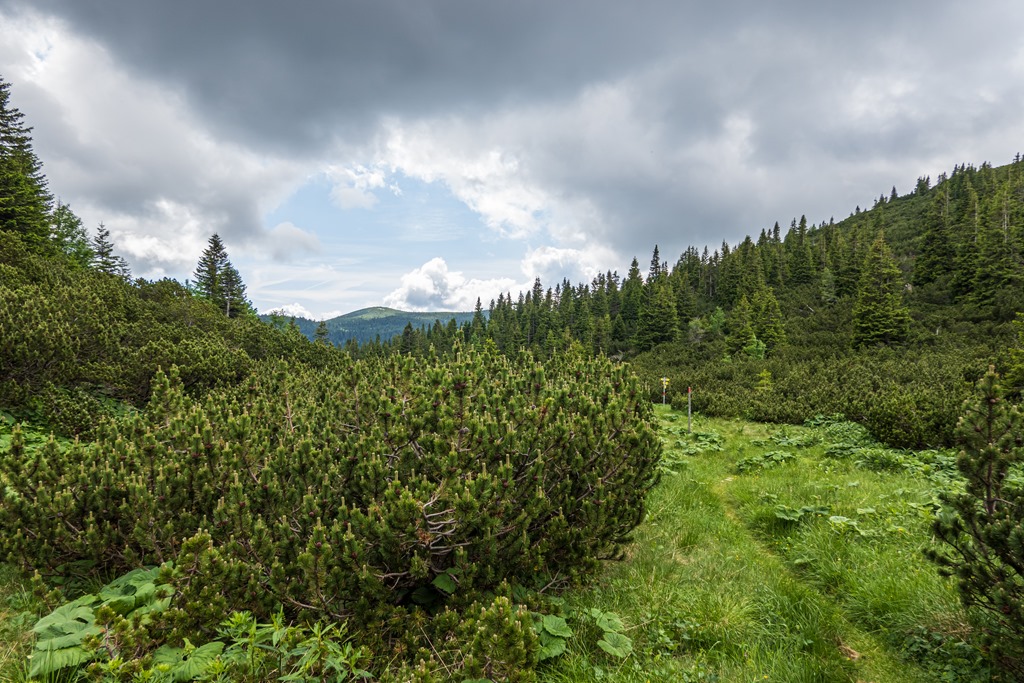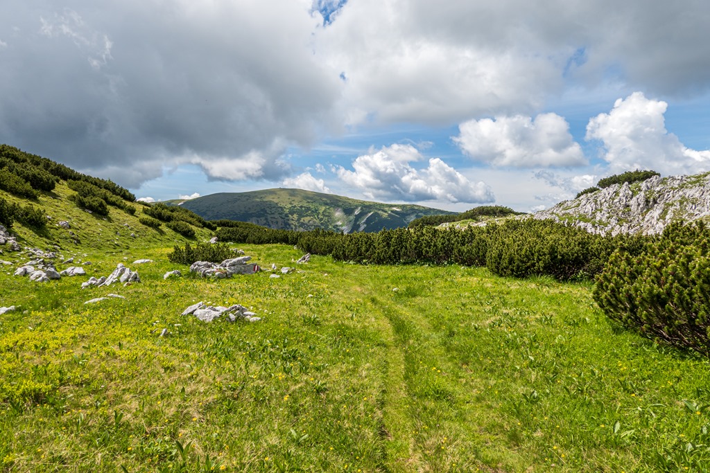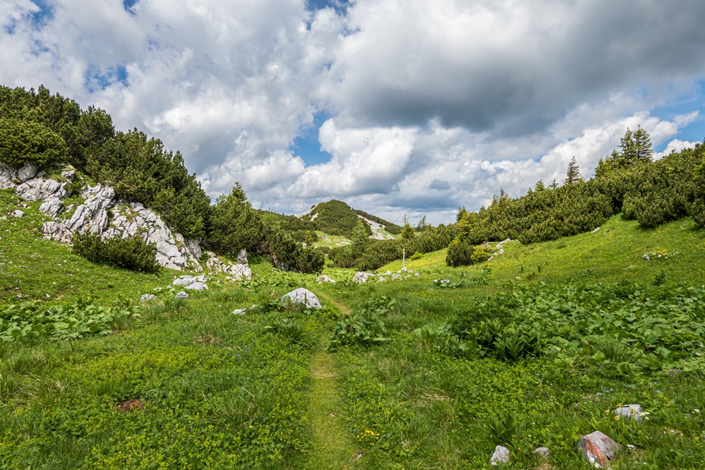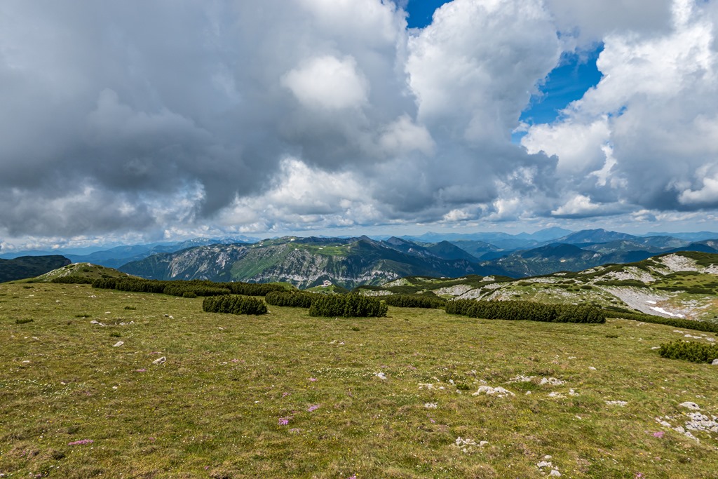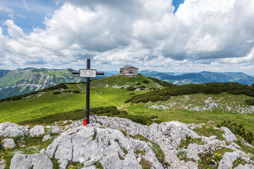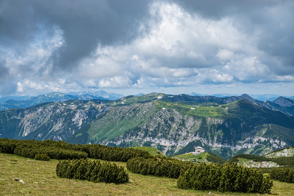 Az út hátramaradó része bár csendesen, de határozottan emelkedik, különöseb nyaktörők nélkül, egészen a Rax legtetejéig. A fenyegető kinézetű, de egyébként ártalmatlan felhők hosszú percekre lefedik a napot, így hőségre panaszra okom nem lehet. Ideális! Egy újabb még számomra ismeretlen csúccsal, az 1924 méter magas Bieskogellal koronázom aznapi kirándulásomat. Igaz, az útról nézve, inkább csak egy füvel benőtt dombnak néz ki, amit a turistaút szalagja elkerül. Odafenn leülök a puha, füvekből és mohából font szőnyegre, és élvezettel elköltöm aznapi enni-innivalómat. Szép kilátásom nyílik következő célomra, a Habsburgházra, amit majd csak érintek.