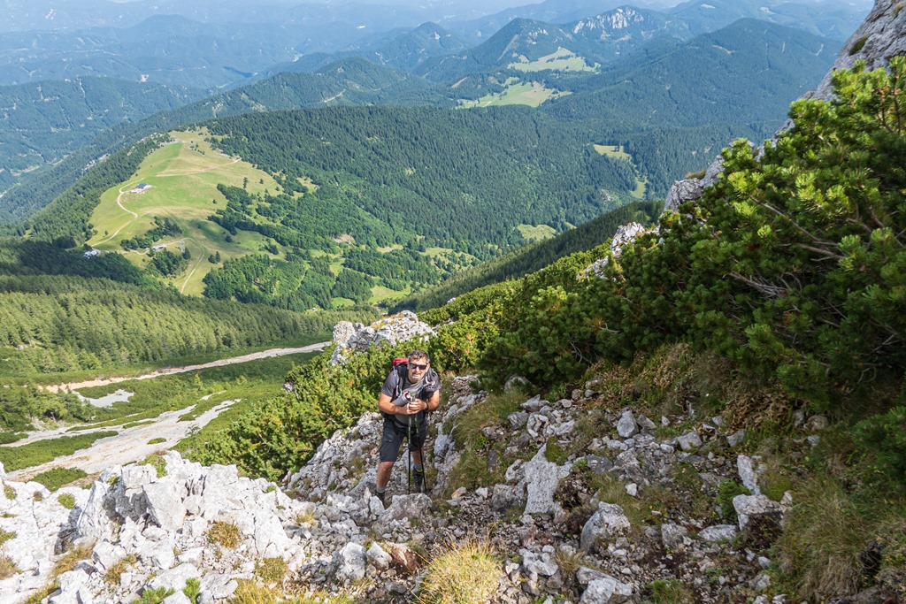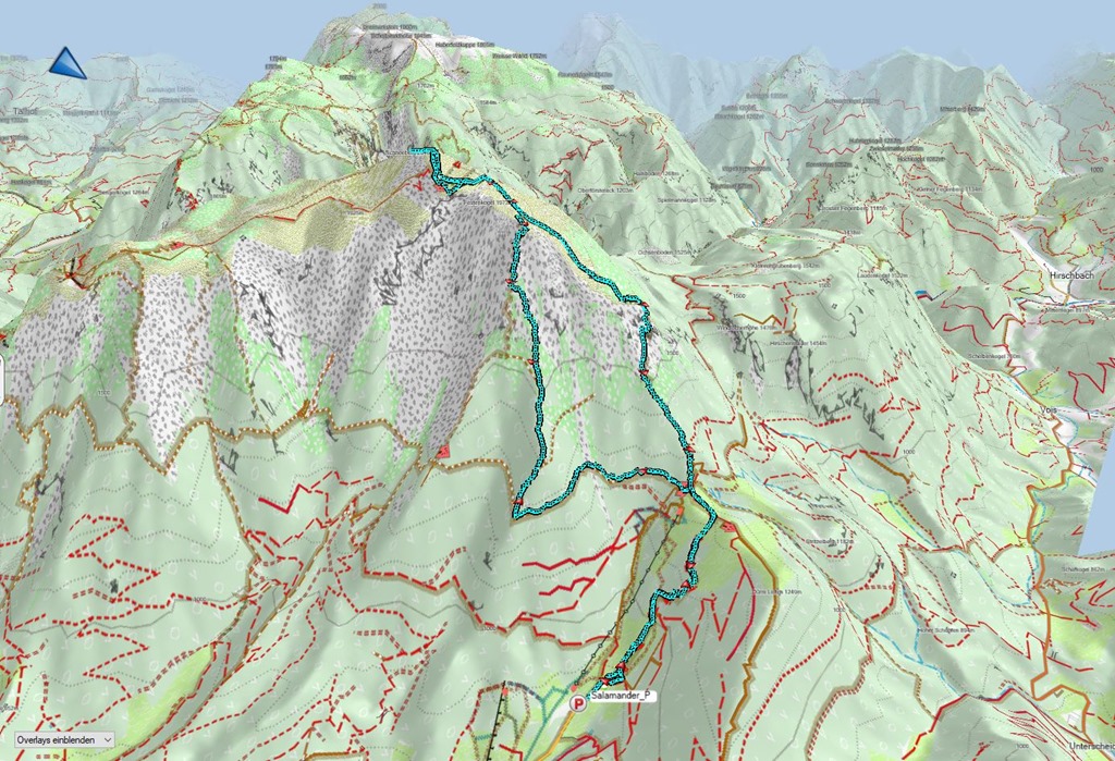 Ez a variáns az „Öreg Nandlgrat” néven ismert túrázók körében. Cirka 4 éve derítettem fel, és az akkori beszámolómban teszek néhány figyelemre érdemes, orientációval kapcsolatbos utalást. Most Attilával vágunk neki Losenheimből, a Szalamandra libegő parkolójából, mely az idén, hirtelen fizetős lett (5€). Az útvonal lényegében a kékkel jól jelzett Nandlgrat utolsó harmadára lyukad ki, és tehát a bevezető 2/3 része különbözik a hivatalosan jelzett Nandlgrattól.