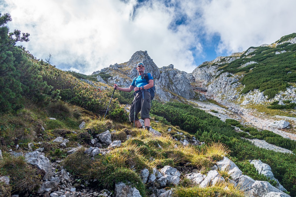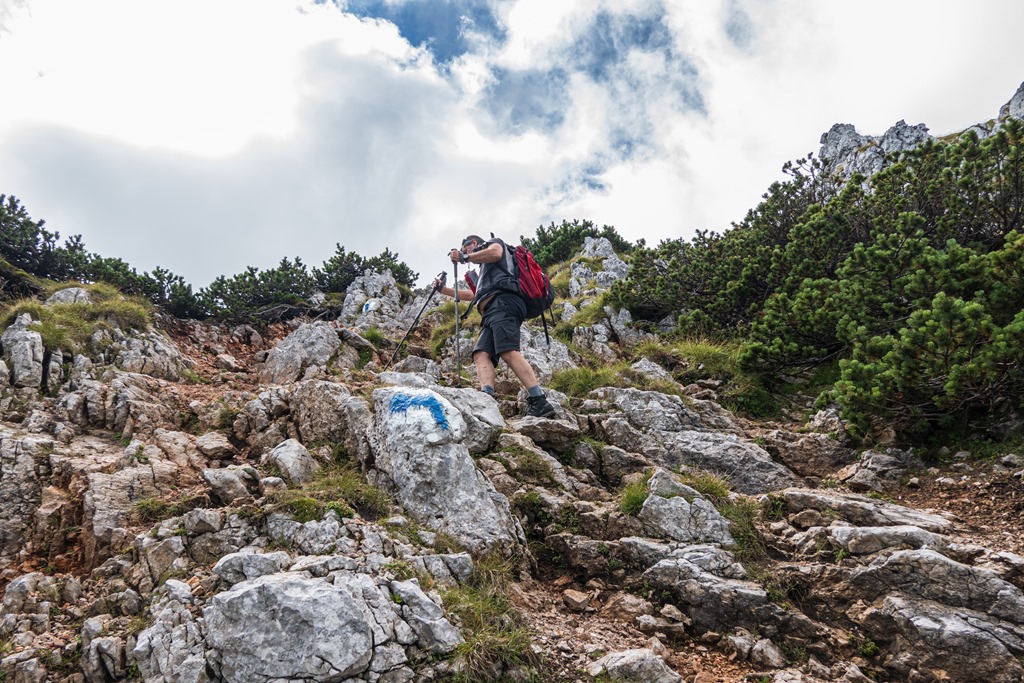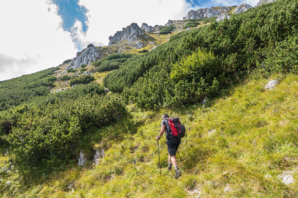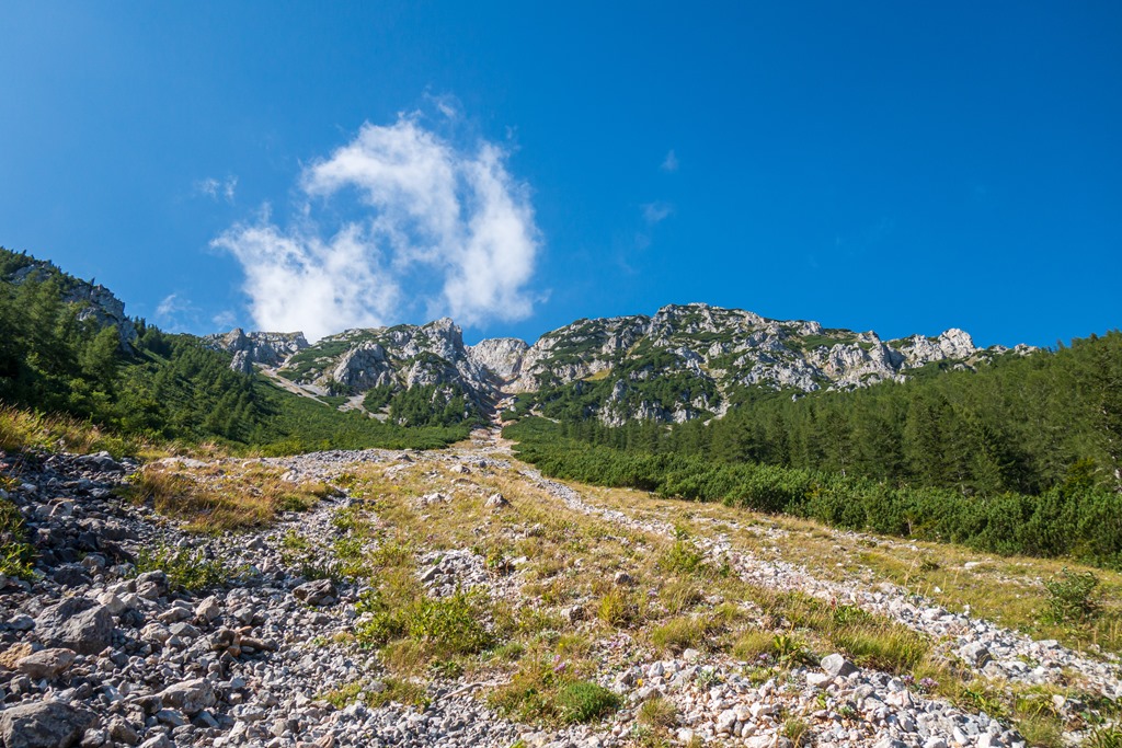 Átvágunk a mezőn, és egy jól látható csapást követünk, mely egyre meredekebben szerpentinez felfelé. Bár a nyomok alapján nem egy elhagyatott útról van szó, a friss vegetáció, vörösfenyők és törpefenyők ágai ugyancsak durván be-belógnak keskeny csapásba. Legközelebb egy metszőollóval szerelkezem majd fel, hogy a legszemtelenebb hajtásokat lecsippenthessem.