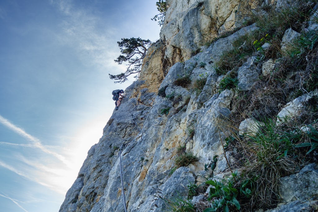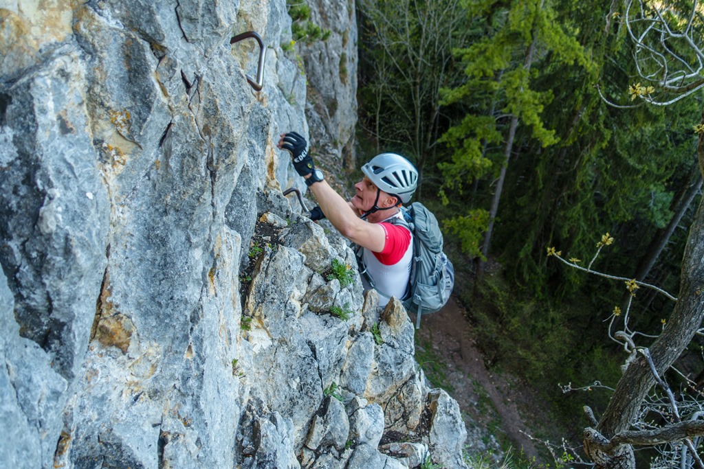 A kékkel jelzett Wandfußsteigre érve, már felpörög a teljesítmény, ömlik rólam a víz. Még néhány perc és elérjük a beszállót. Szerencsére, úgy tűnik, senki sincs előttünk, csak feljebb a falban hallunk hangokat. Figyelem magam. Most mit tegyek? Mint az már ilyenkor többször működött, magától is, tépelődés helyett hagyom, hogy a zsigereim vezessenek. Egyszerűen csak teszem a dolgom. Elkezdek készülődni. A tudatom, mintha egy különálló entitás lenne, csak figyeli serénykedésem, nem szól közbe. Sisak, beülő, kesztyű. Még egy korty a tömlőből és jöhet a haddelhadd.