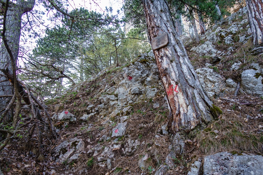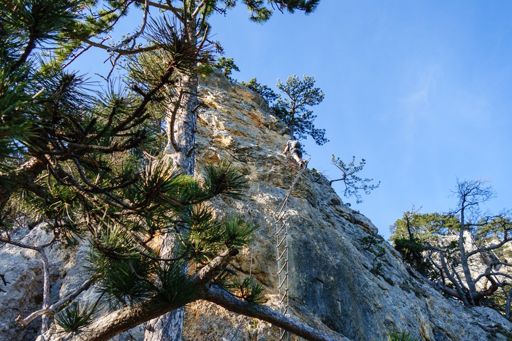 Amennyiben nyitva a kunyhó és kapok sört, mondogatom, nyitott vagyok a folytatásra. Mivel magam szabta feltételeim teljesülnek, folyadékpótlás után alászállunk a Springlessteigen egy fatáblával jelzett pontig, amit ha direkt nem keresünk, könnyen elvétenénk. De mivel direkt is figyeljük, megtaláljuk a Wildenauer felé vezető letérőt (fenti kép egy korábbi alkalomról). Ez a kürtőben végződő mászóka jellegében teljesen elüt a hagyományos ferratáktól. Tudniillik nincs drótkötél, illetve csak egyetlen ártalmatlan A-helyen, ahol nem is lenne rá szükség, mert inkább csak kalauzol.