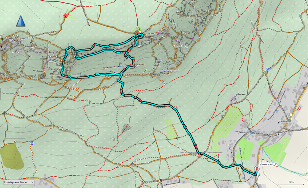 Némi kellemes és tudatosan örömteli elidőzés után újra a Springlessteigen vagyunk, de most csak elhaladunk az imént használt letérő mellett, vissza zweiersdorfi parkolóba.