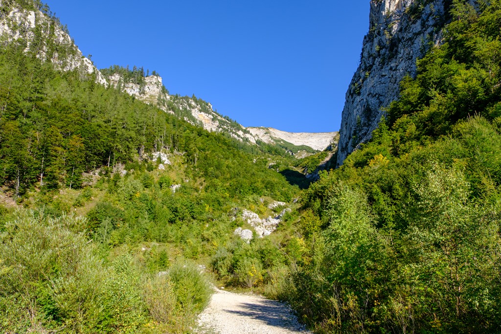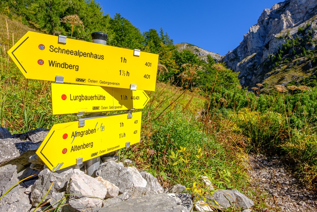 9:00 óra lehet, amikor elindulok Altenberg an der Rax kistelepülés szélén, a Lohmgraben (fenti képen) szájában fekvő parkolóból. Pompázatos nap elébe nézek. Minden vonatkozásban tökéletes túraidő vár rám. Felhőtlen kék ég, gyengéd légmozgás. Már eme vad és nyers kulissza látványa is örömmel tölt el. Pedig sajnos kicsit bicegek, itt-ott húzom a jobb lábam, mert utóbb is tán megerőltettem, de ezen a csodaszép kora őszi napon ki sem bírtam volna odahaza. A kör, amit választok is, ezért, inkább lazább paraméterekkel bír.