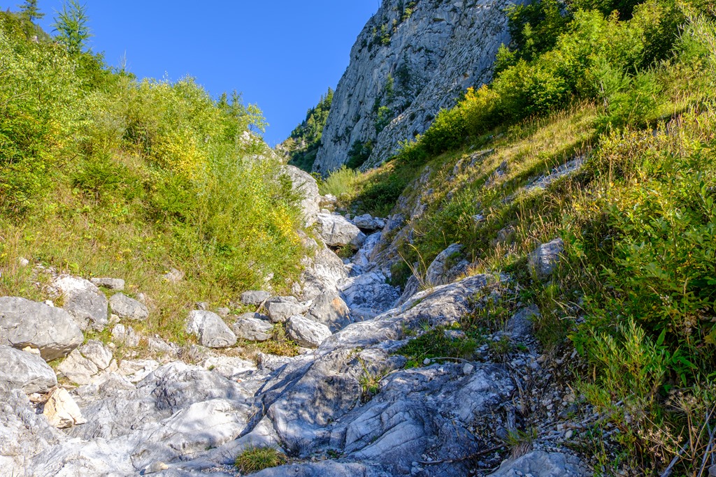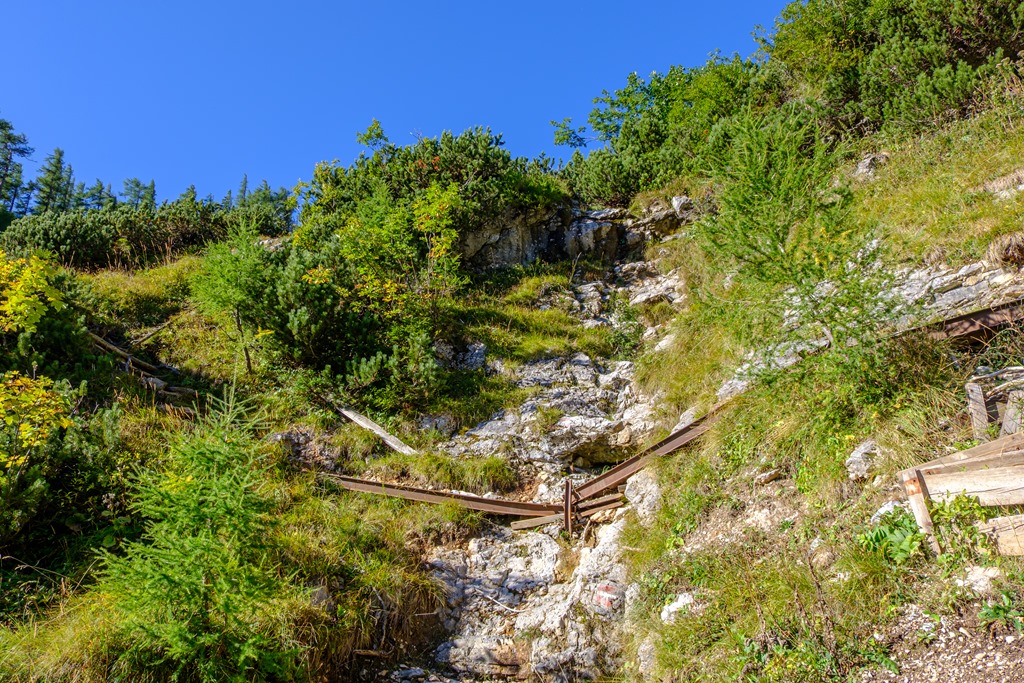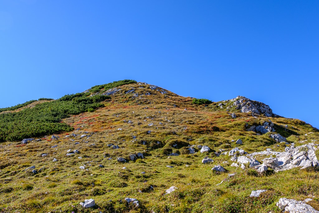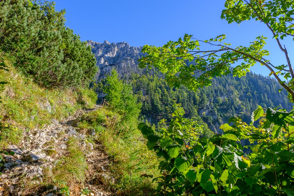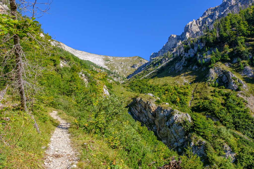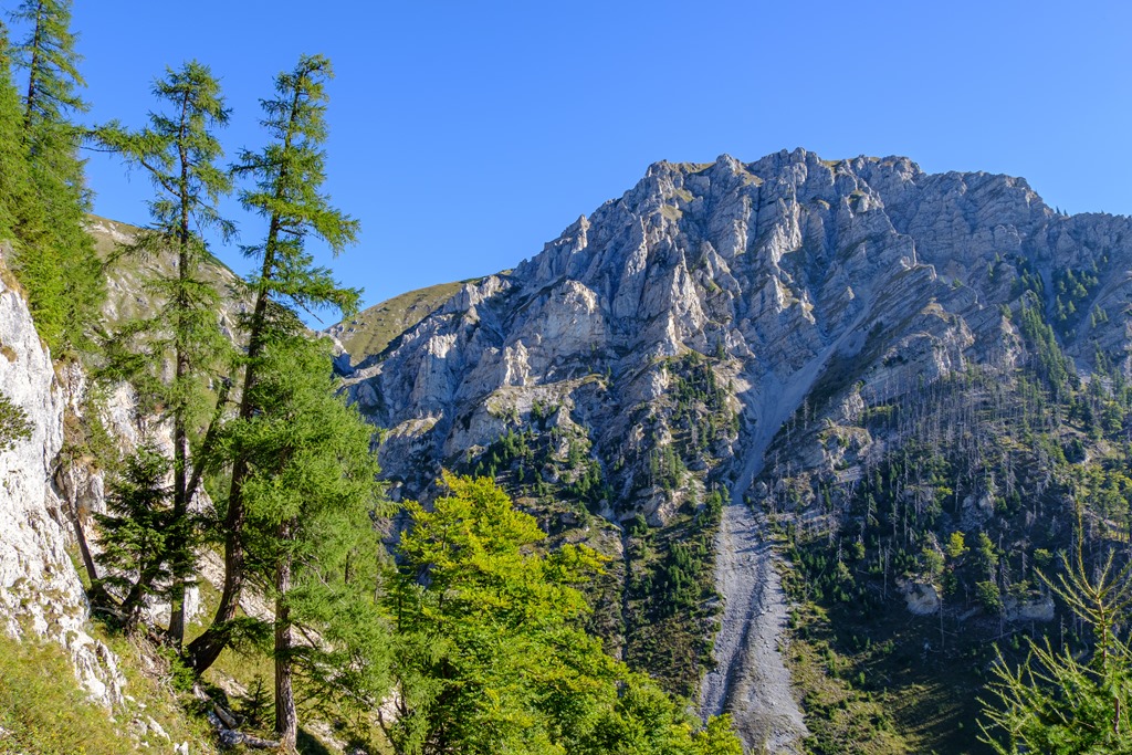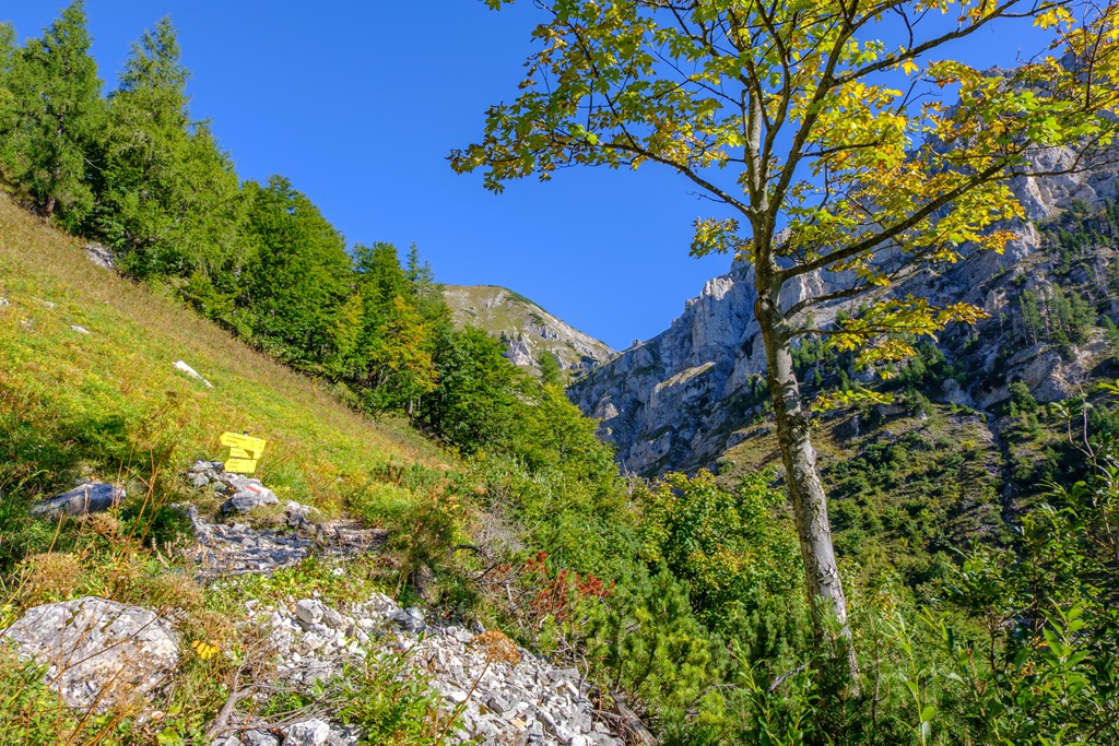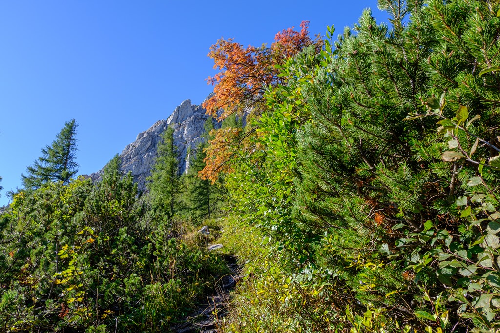Cirka egy óra alatt érem el a Blarergraben felé tartó elágazást, mely egyben indítója a derekasabb, emelkedők sorozatának. További egy óra a plató elérése. Közben persze számtalan alaklommal van módom belegyönyörködni az átellenben kibontakozó sziklavilágba. Az kezdődő, fiatal ősz színei elvarázsolnak.