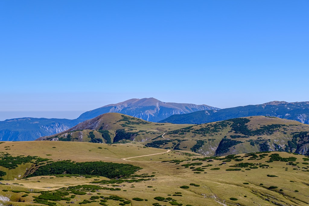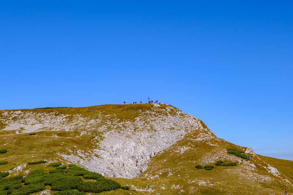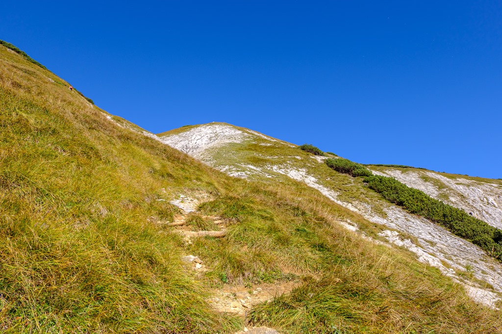 Sziklával megszórt füves hegyháton elég gyorsan és főleg minden gond nélkül fel is jutok a csúcsra (11:25). Egy igazi, kúp szerű füves orom (fenti képen). A nyugati szél belém kap. Nem igazán hideg, csak kellemetlenül lökdös. Nem is maradok hát odafenn sokáig, alászállok és folytatom a rendes, a Nagy Windbergre (11:40).