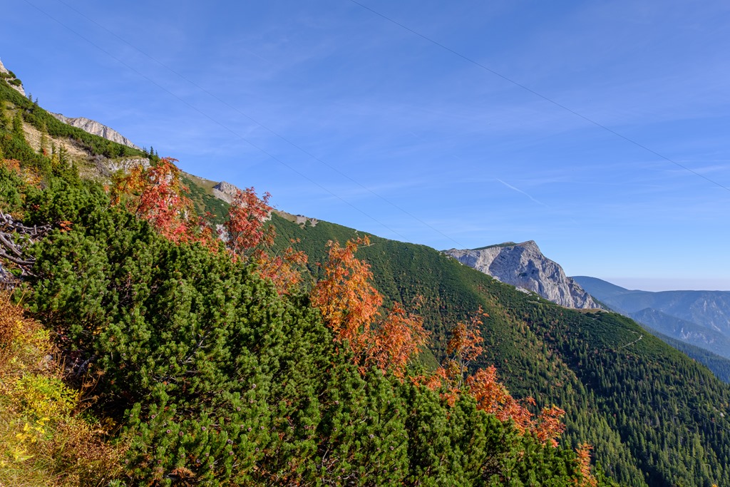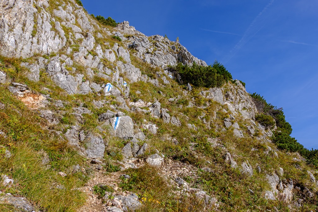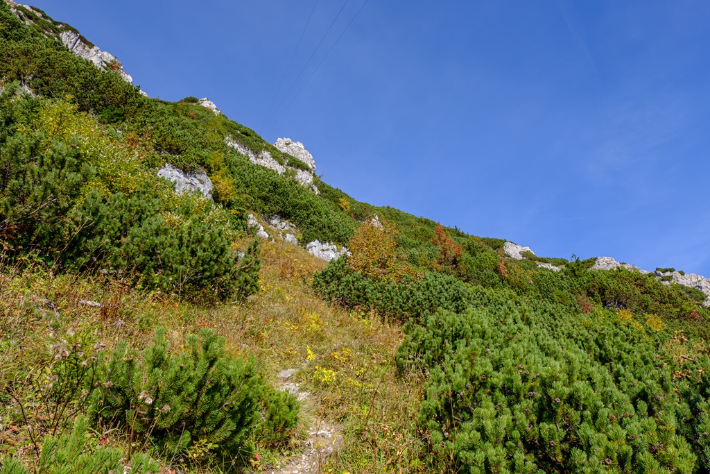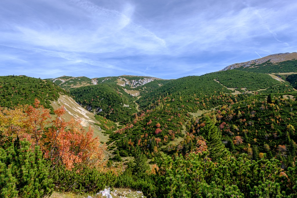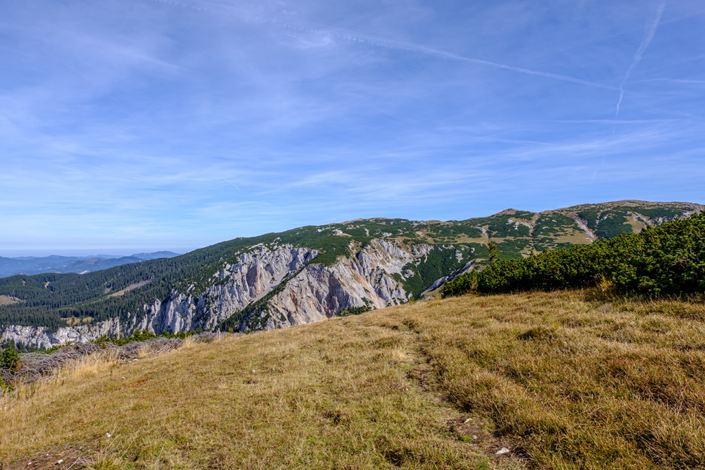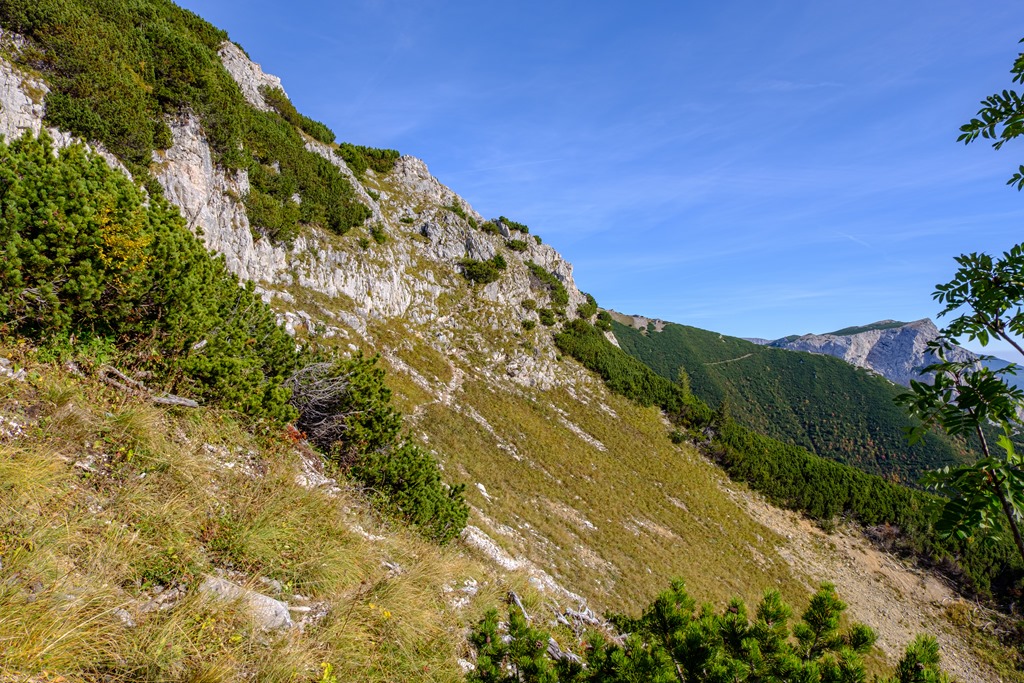 Mint az már lenni szokott, nem sokkal 9:00 óra előtt vágom magam haptákba, hogy nekilendüljek Prenier Gescheidből. Szokatlanul nagy a tülekedés a parkolóban. Mintha fél Ausztria jusztból is ide tolongana. De ahogy bandukolok felfelé a Reißtalersteigen, úgy csitul a népek zsivaja. Mígnem, teljes magány és egyedüllét szakad rám. A Kontrussteigen hamarosan elérem ama kiszemelt letérőt (10:00, fenti kép), és gyermekded örömmel kezdem meg a teljesen ismeretlen turistaút felfedezését.