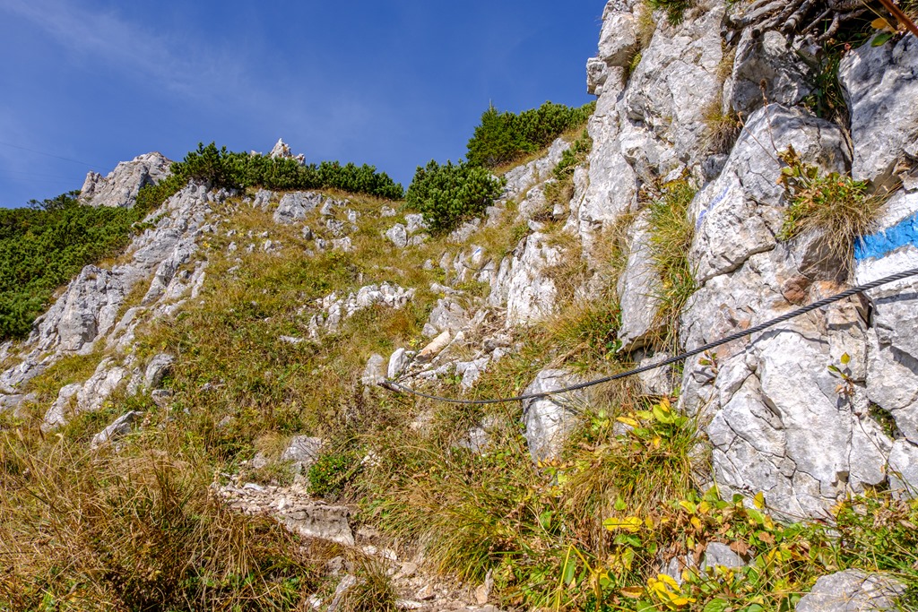 A mindvégig jól követhető, kékkel jelzett Raxenmäersteig eleinte tétován keresgéli magának a felfelé vezető utat, majd a függőleges falak tövébe érve jobbra fordul, harántol, mielőtt eléri azt a tulajdonképpeni pontot, ahol 1- és A szinten átlendül az előtte tornyosuló akadályon (10:43). A mászás nem nehéz, élvezetes és sajnos rövid. Alig 10 perc elteltével már elérem Karl Katner-Steig vonalát, amelybe a Raxenmäersteig torkollik. Még némi tüdőköptető kaptató, és máris a platón vagyok (11:00).