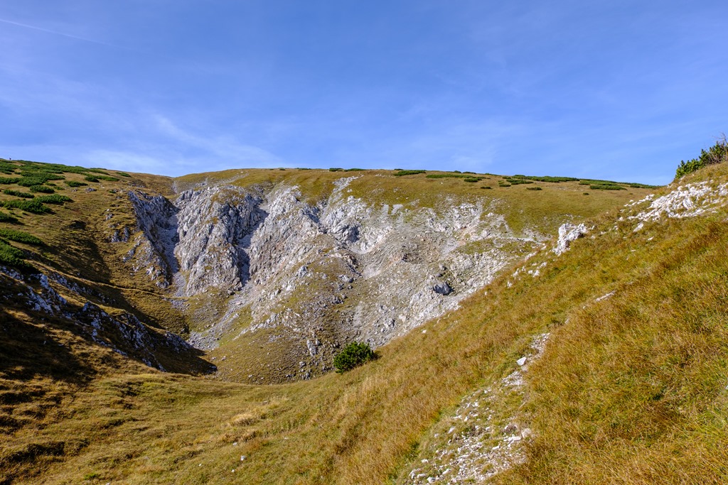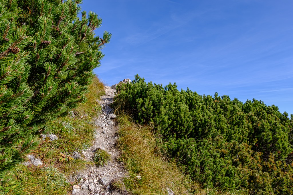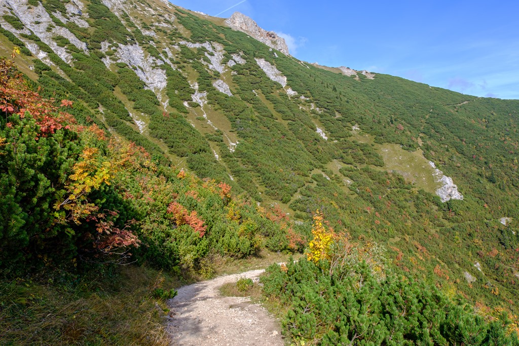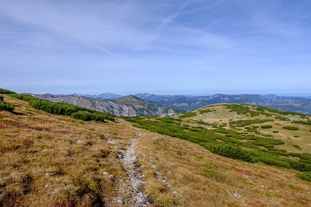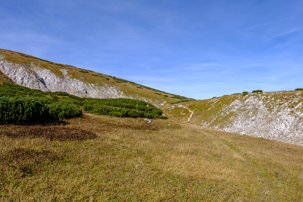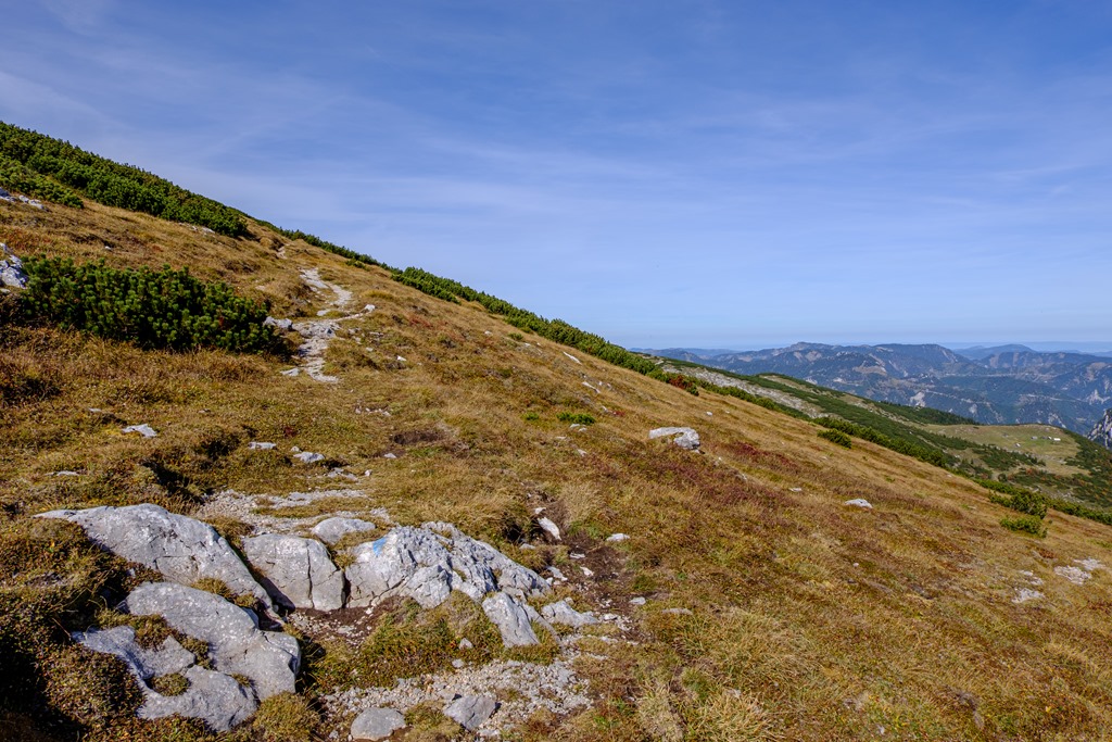 A Karl Ludwig-Haust messziről elkerülöm és folytatom a Heukuppe csúcsa felé. Azaz csak folytatnám, mert a kiszemelt, újfent ismeretlen turistaútra térek le jobbra (fenti képek), mely a Heukuppe északi oldalára terelget. Talán 100 m szintemelkedés híján visz el a csúcs alatt, ami önmagában nem vonz annyira, hisz télben-nyárban már rengetegszer köszöntöttük egymást.