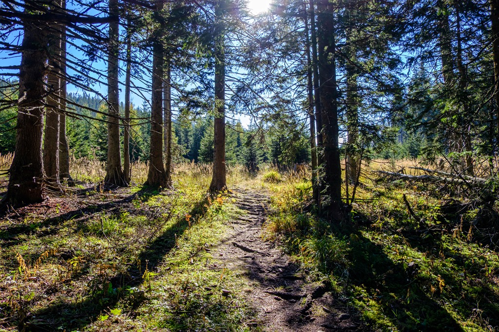 Az út itt szerpentinekben keresgéli a megfelelő csapást felfelé. Egy öklömnyi kő zúg el mellettem pár méterrel. A nemjóját! A lejtők meredekebbek, és helyenként drótkötél biztosítással ellátottak. Az utolsó emilyen rámpa után (fenti kép) vége a sziklás részeknek és néhány perces erdei kaptatás után, lőn halleluja, kiérek a langymeleg napsugarak nyaldosta, ingoványos platóra.