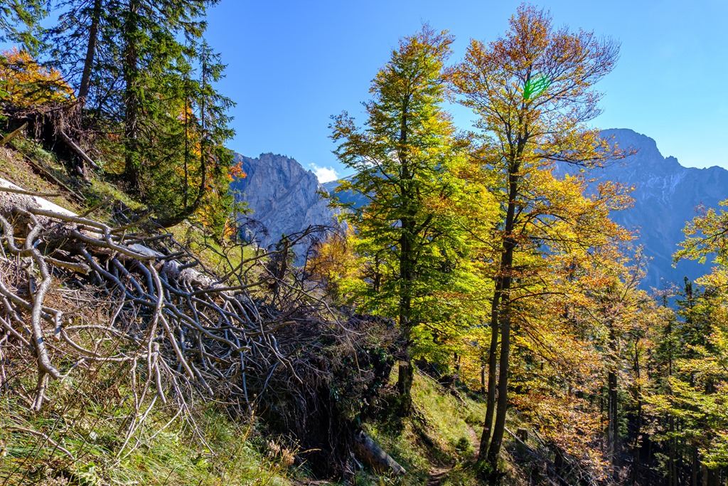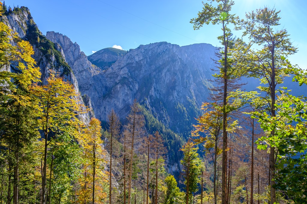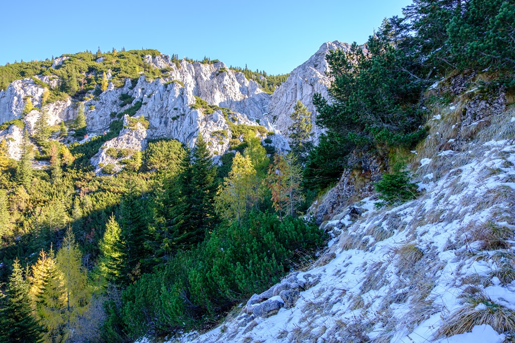 Máris az erdőben vagyok és egyelőre a hegyek árnyékában, meredeknél meredekebb kaptatók sorozatán haladok a napsütötte plató felé. A jól jelzett turistaút első része afféle bemelegítő, mert cirka fél óra elteltével elérem a sziklafalak (Scheibwaldmauer) alkotta zárógátat.