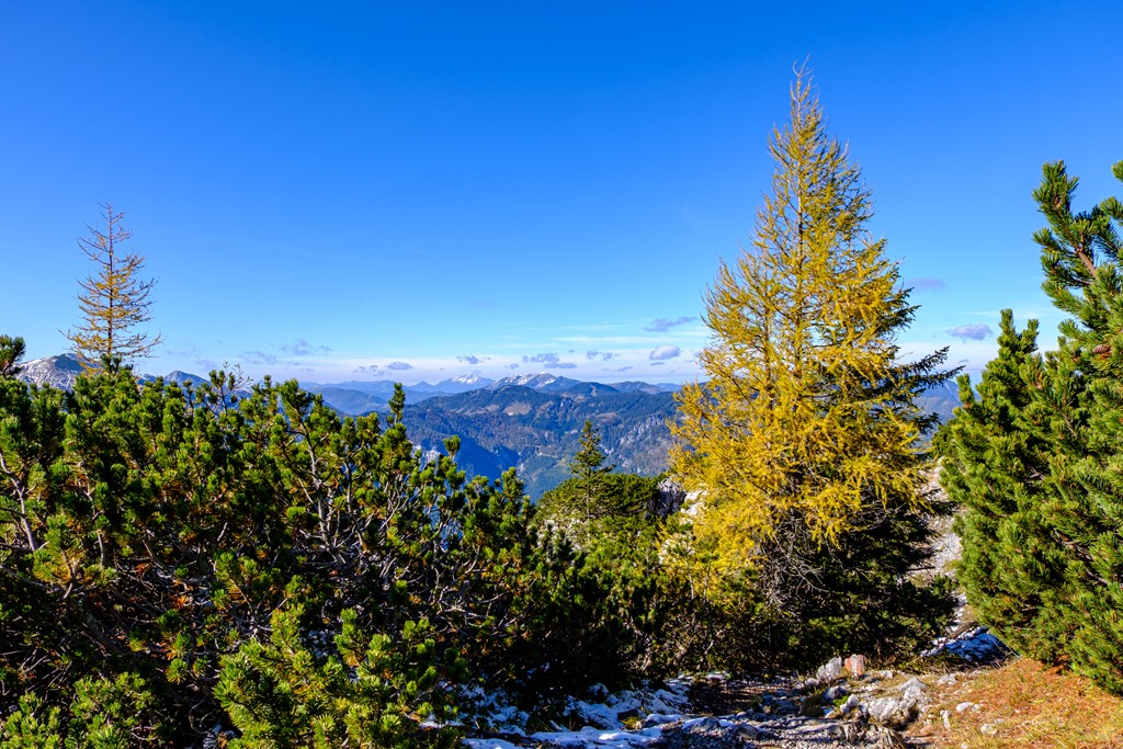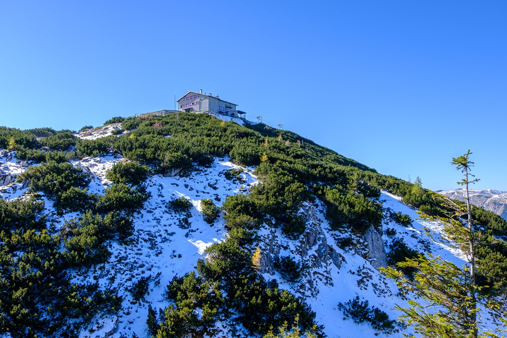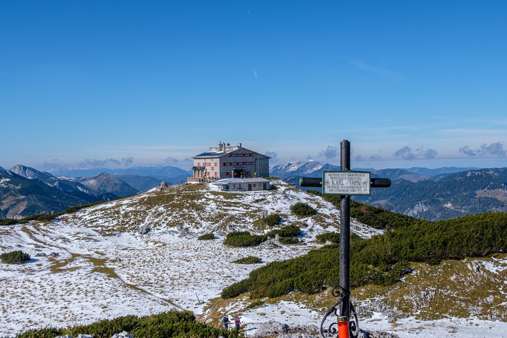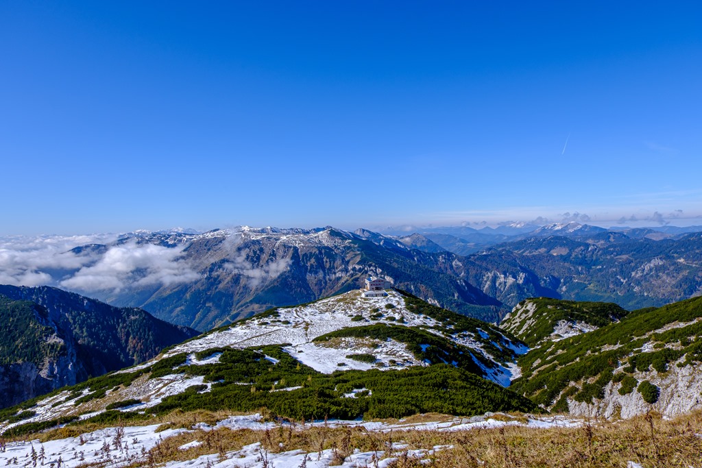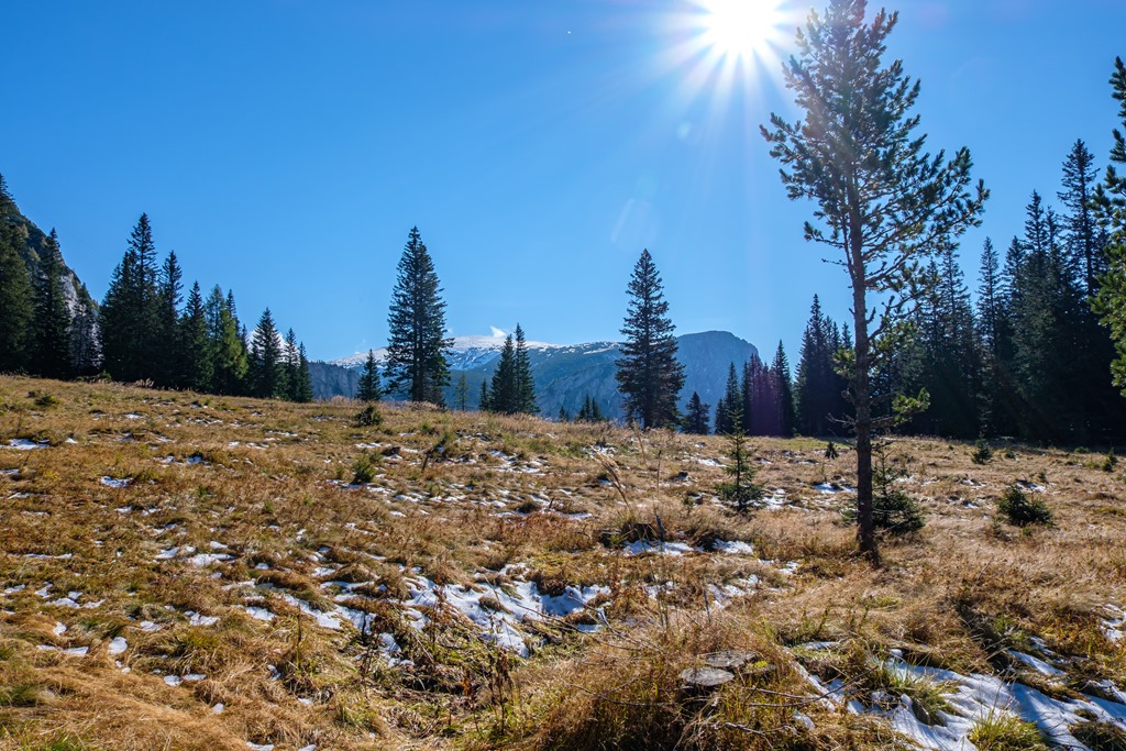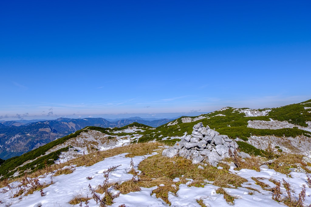 A Habsburgház alatt kilyukadva teljes a téli benyomás. A hóréteg bár nem vastag, alig néhány centi, de részeiben összefüggő. Kinézem magamnak a menedékház fölé emelkedő legközelebbi csúcsot. Feltérképezem magamban a törpefenyők zárvonalát és beazonosítom a rést, ahol út nyílik. Felérek gond nélkül. Remek panorámát kapok ajándékba (lenti képek). Kinézek magamnak két más névtelen domborulatot a legközelebbi alkalomra, begyűjtés céljából.