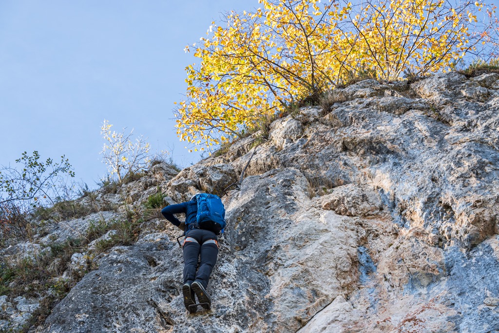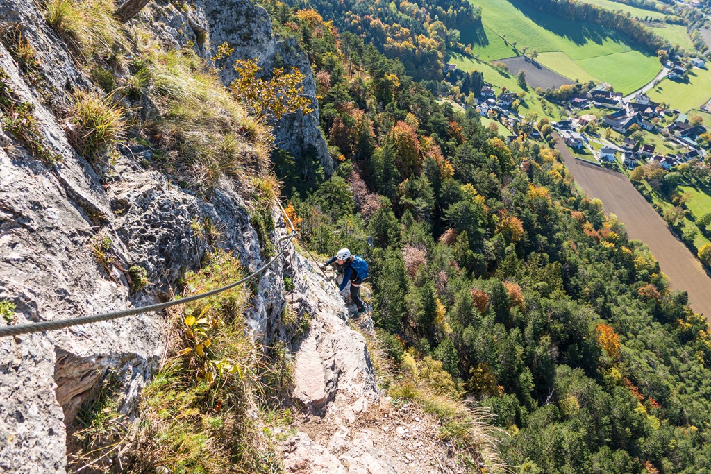 Pár percnyi egyensúlyozás következik az időnként az aljnövényzetbe vesző keskeny kis csíkon. Az első szakasz ferrata rendes, drótkötéllel biztosított, semmi különös. A második rész a viccesebb, tudniillik egy miniatűr Wildenaurról van szó, U-vasakkal ellátva, de drótkötél nélkül. A kantárt be lehet akasztani a vasfokokba. Biztonságos fogódzkodás elengedhetetlen, mert a fal itt is áthajlásos, kifelé nyom. A kilepőt pedig, tudniillik ott, ahol újra drótkötél fogad, egy ormótlan, kifelé terpeszkedő sziklatömb állja el. A kulcspont! Itt meg kell találni a megfelelő testhelyzetet, hogy effektíve fel lehessen lendülni a könnyű befejező szakaszra.