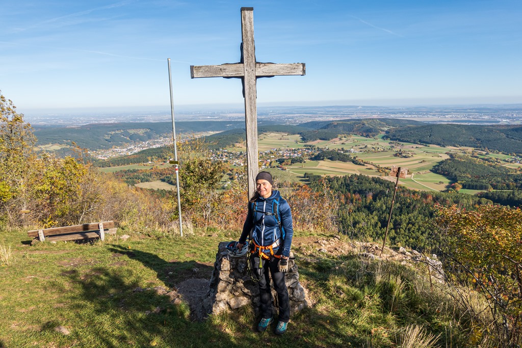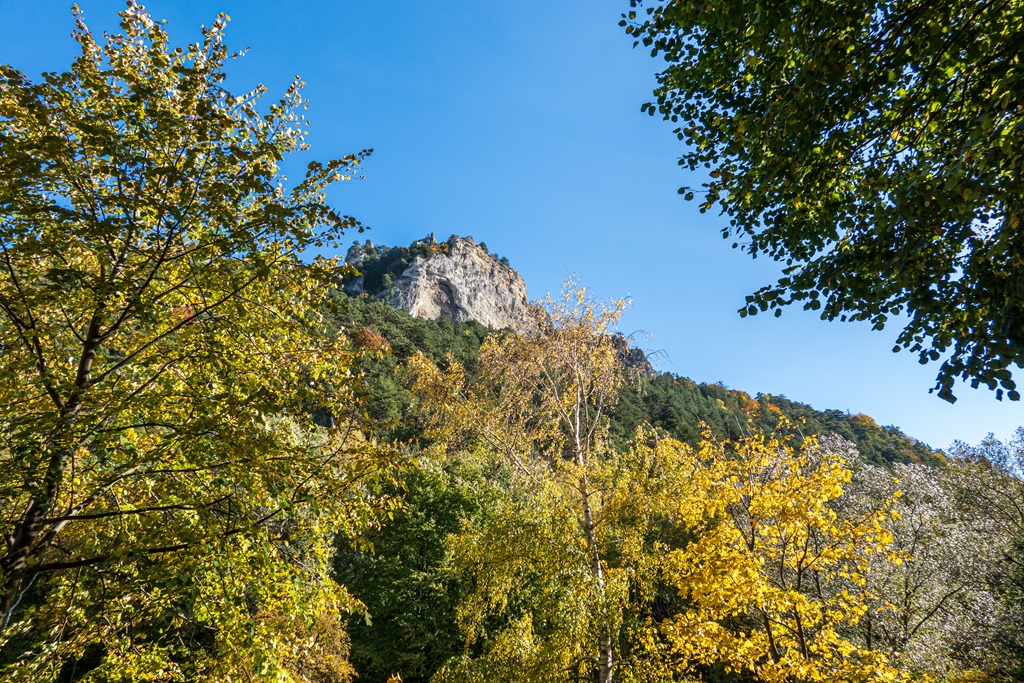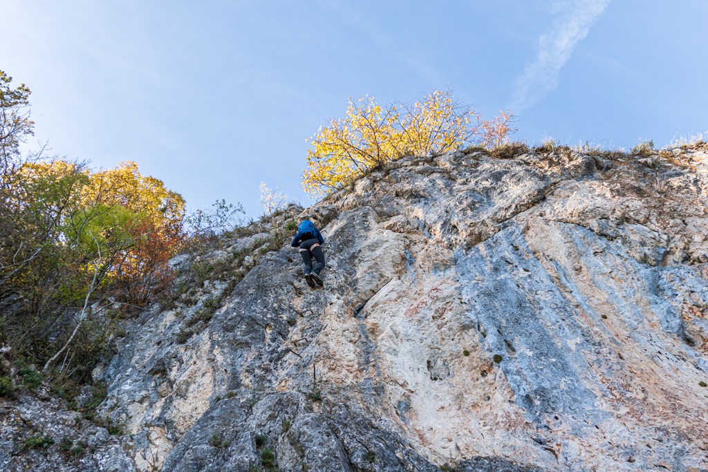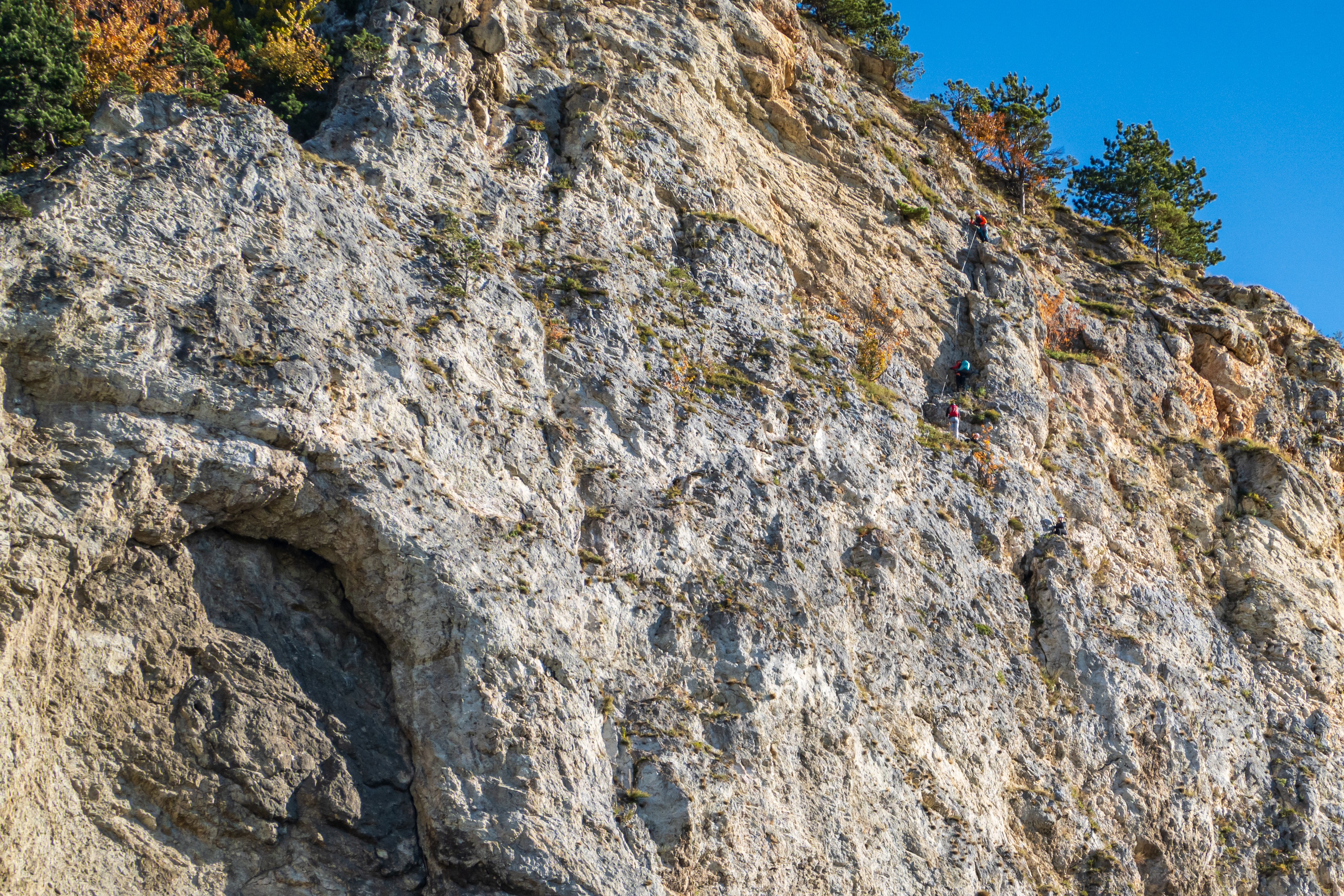 A továbbiakban átautózunk Dreistettenbe és a sportpálya melletti parkolóból indulunk az őszi színekben pompázó Hohe Wand falai felé. Na, gondolom útközben, de ez aztán tényleg nem lehet gond. Egy zöldfülű kezdőknek való pálya. Valóban, nem gond, de annyi sok év után, meglepetés. Mert a kínálkozó támpontok olyan lekerekítettek és simák, mint a tükör. Hja, tömegek bakancsa fényezi folyamatosan. A barlangból felfelé vezető vaslétra meg nem csak egyszerűen függőleges, hanem kissé áthajlásos, kifelé nyomja a testet. Állandó fogódzkodás, mérsékelt, de határozott erőkifejtés elengedhetetlen.