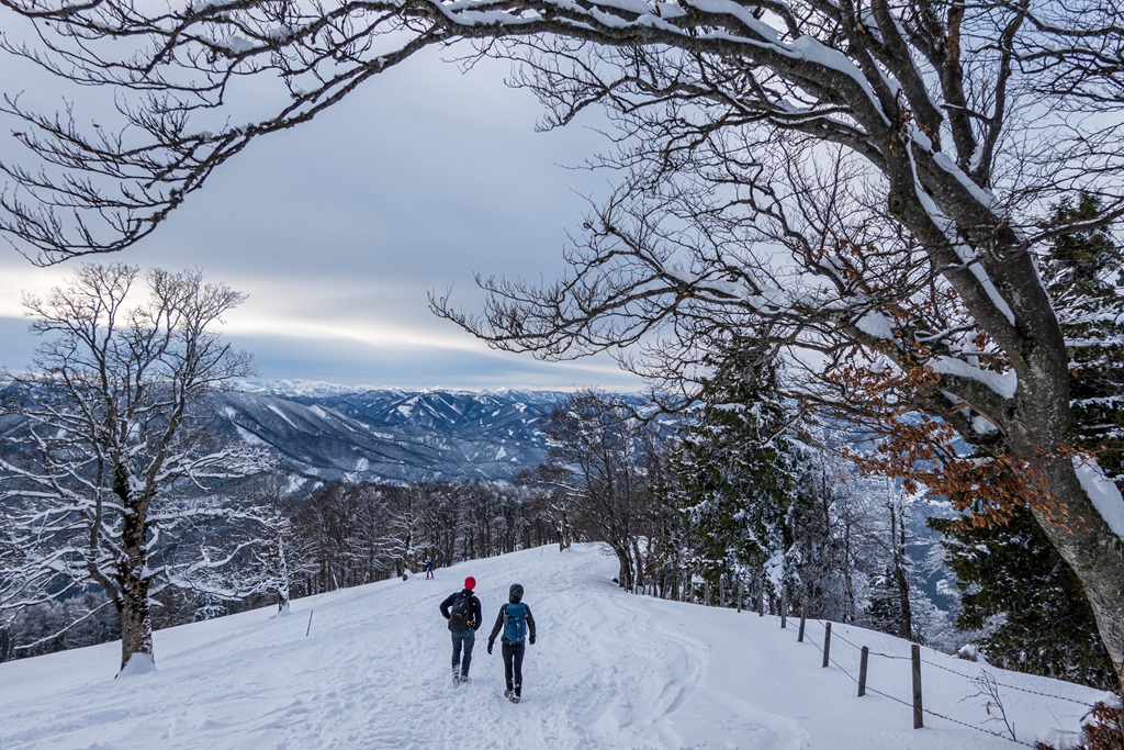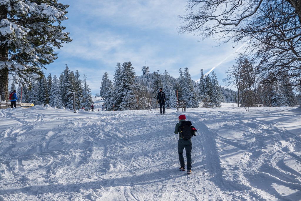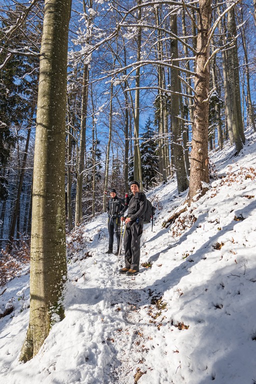 A továbbiakban, a jó meredekre szabott Klostertreppenen át, helyenként térdig süppedve a hóban, fel a Muckenkogel tetejére (alábbi képek).