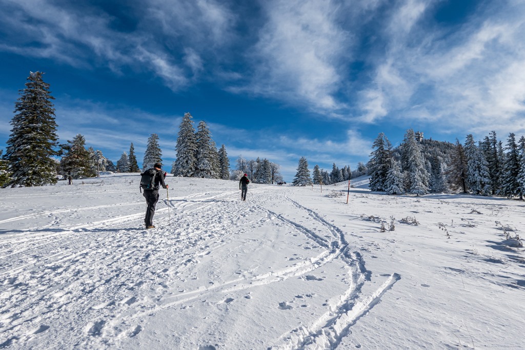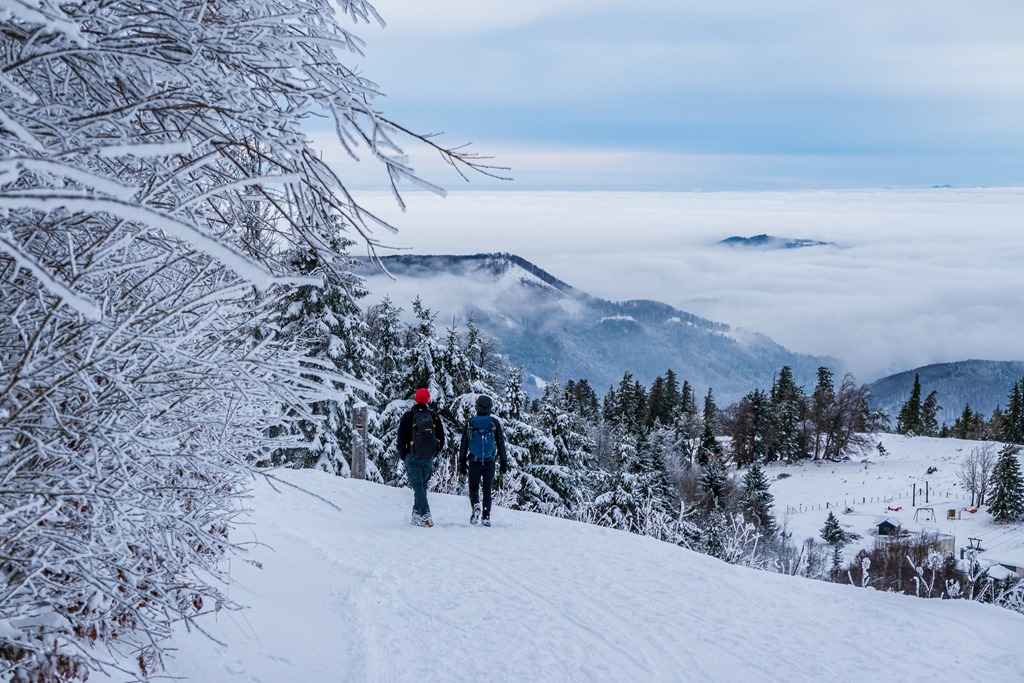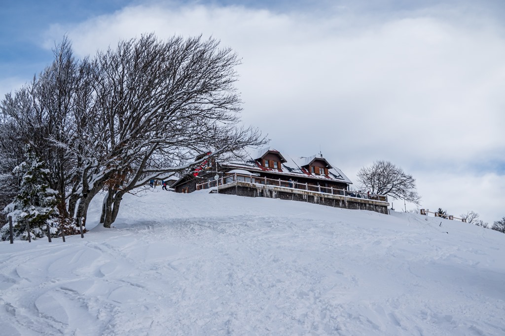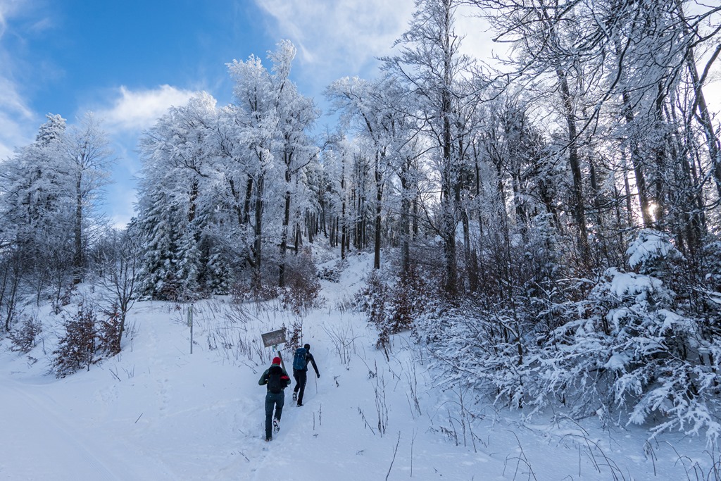 A korábban még ragyogó napsütés kezd gyengélkedni. Alattomos de szelíd felhő csorda tolakszik be a képbe. A szélcsend csak a Waldmarkwegre hallgató, csúcskereszt előtti utolsó felszökésen jön zavarba. Szerencsére csak gyengéden libbenő formában, de a kitartó fagynak köszönhetően így is csontig hatol. Tudniillik az egyébként befűtött vendégszobával váró Hinteralm-Hütte, most, sajnálattal csak a téli megbúvó helységét kínálhatja fel (Abszurdisztán itt is visszaköszön).