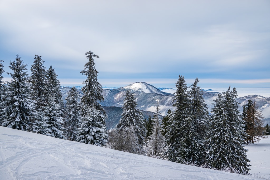 A Galtzwiesensattelon és a Karlsteinen át (fenti képek) érkezünk a téli álmát alvó Lilienfelderhüttehez. Miközben folyamatosan suhannak el mellettünk a sítúrázók, gyengéd emelkedőn baktatunk a Muckenkogel irányában. Nos, ez lenne ama, már oly sokszor mesebélinek titulált szakasz (alábbi képek).
