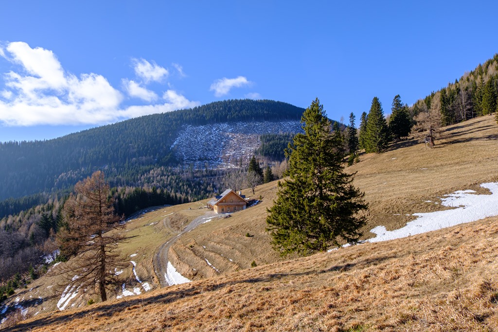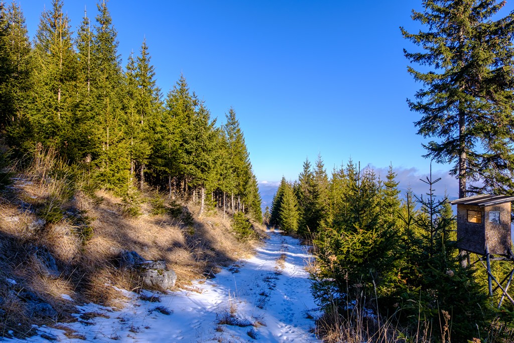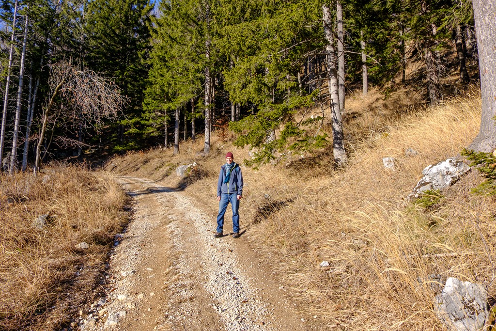 Egy jó fél órát sziesztázgatunk és csak kénytelen kelletlen állunk tovább, mert lassan-lassan, nap ide, szélcsend oda, a csontjainkba azért mégiscsak beólálkodik a gyenge fagy. Úttalanul ereszkedünk a Hengst északkeleti gerincén le a Nagy Nyeregbe, ahol még van szép optikát mutató hóból is elég. Ezután már csak széles, szerpentinekben kanyargó erdészeti utak hálózatán át bandukolunk a Hengsthütte tövébe, majd tovább le, vissza a kiindulópontunkba.