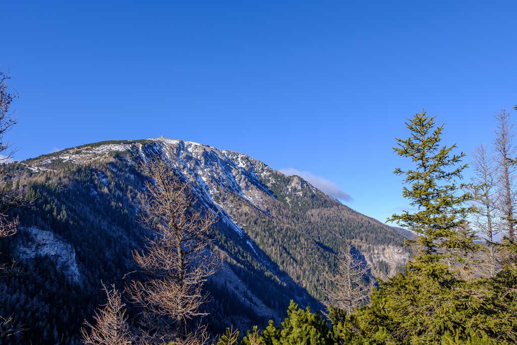Alig egy negyed óra, húsz perc alatt végzünk is az utolsó felszökésekkel és máris odafenn vagyunk, a Schneeberg-vidéke egyik legszebb kilátó hegyén. A légmozgás olyan gyenge, helyenként tökéletes szélcsenddel, hogy a fára szegezett csúcskereszt alatt azon nyomban le is telepszünk csak úgy a földre és elmajszoljuk a magunkkal hozottakat.