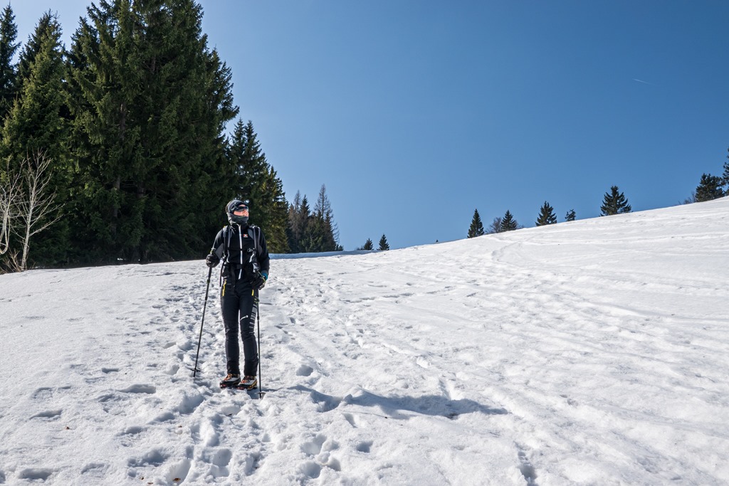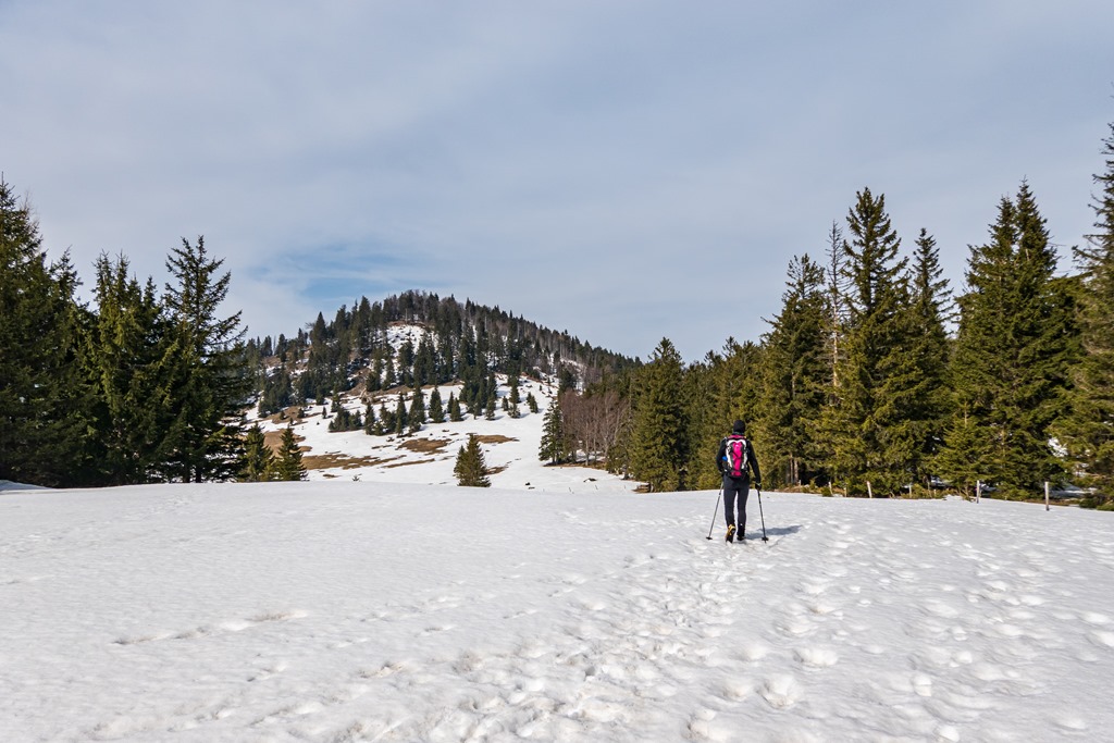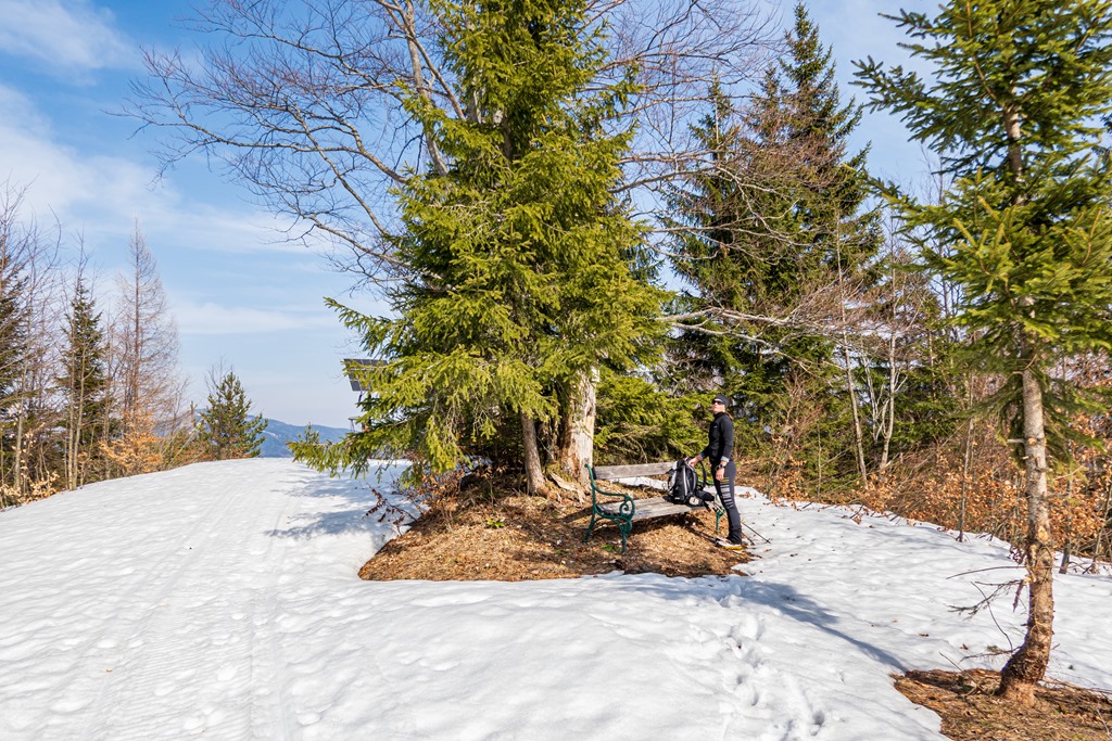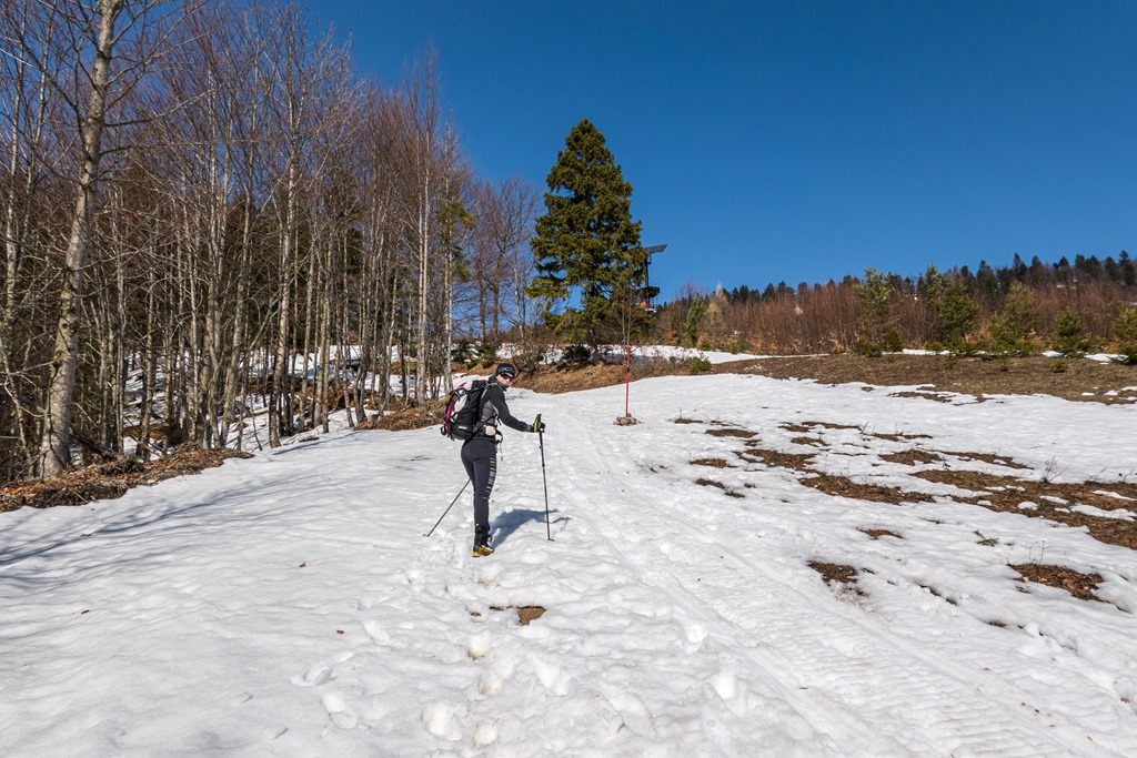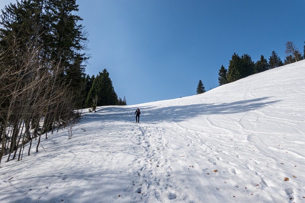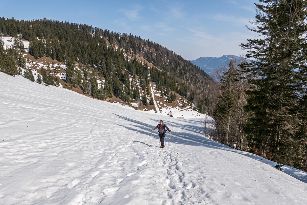 Az egykori síterep parkolója feletti erdészeti út egy szakaszon már majdnem teljesen hómentes, a továbbiakban viszont, a Gschwendthütte feletti részen, a Linsbergig még jó vastag hóréteg fedi a mezőt. A szél, bár itt-ott kellemetlenül lökdös, de várakozásaink alatt marad, ami kedvünkre van. Helyenként még el is csitul és olyankor érződik a nap ereje is.