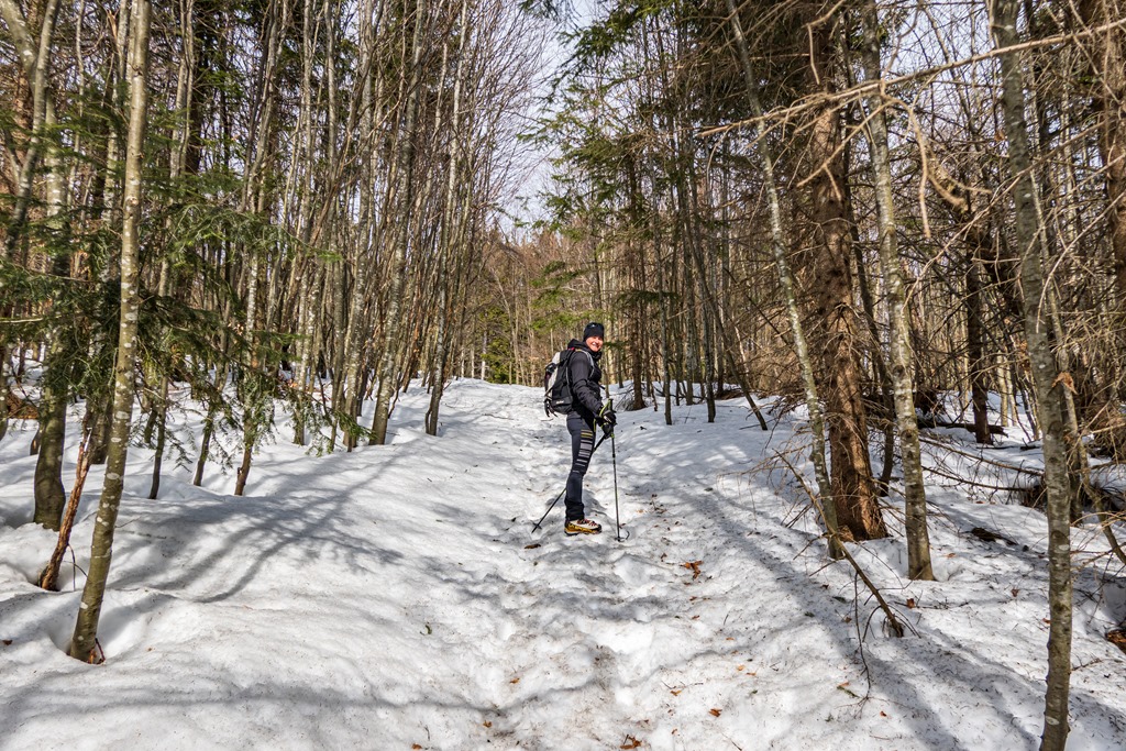 Negyed tíz lehet amikor nekivágunk. Ami a szeleket illeti, nem tévedünk. Az árokban menetelve nincs jelentősebb légáram, de az erdő hangos sóhajtásaiból ítélve feljebb jócskán cibálhat. Alul hónak egyelőre nyoma sincs, csak később, úgy 700 m szinten szaladunk bele hirtelen a télbe. Egyik pillanatról a másikra, szinte átmenet nélkül kifehéredik alattunk az erdészeti út meg a minket körülölelő táj.