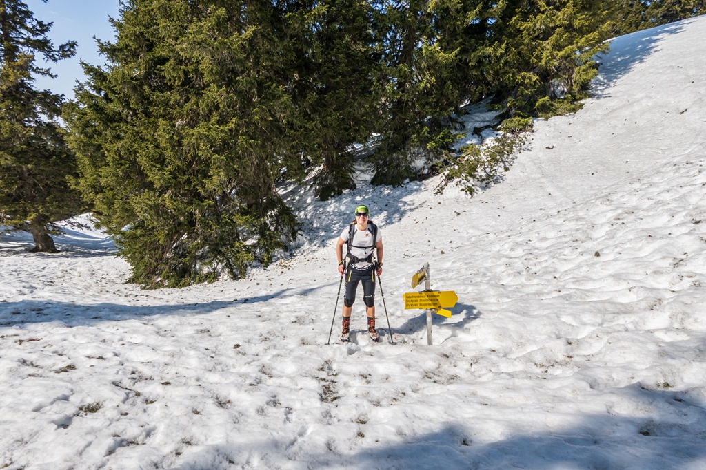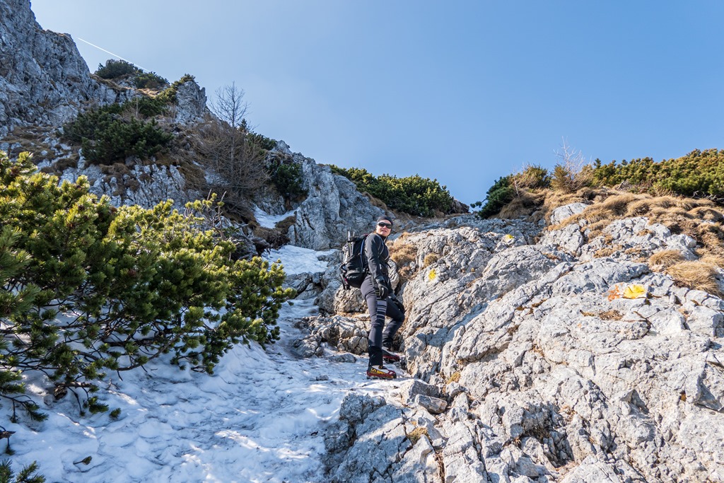 Csúszásgátlót legelőször az Alsó-Fadensetig tövéig vezető, erdei kaptatón húzunk (9:35), majd ott le is vetjük, mert a Felső-Fadensteig kezdetéig, gyakorlatilag hó és jégmentes a terep (mint általában minden egyes alkalommal).