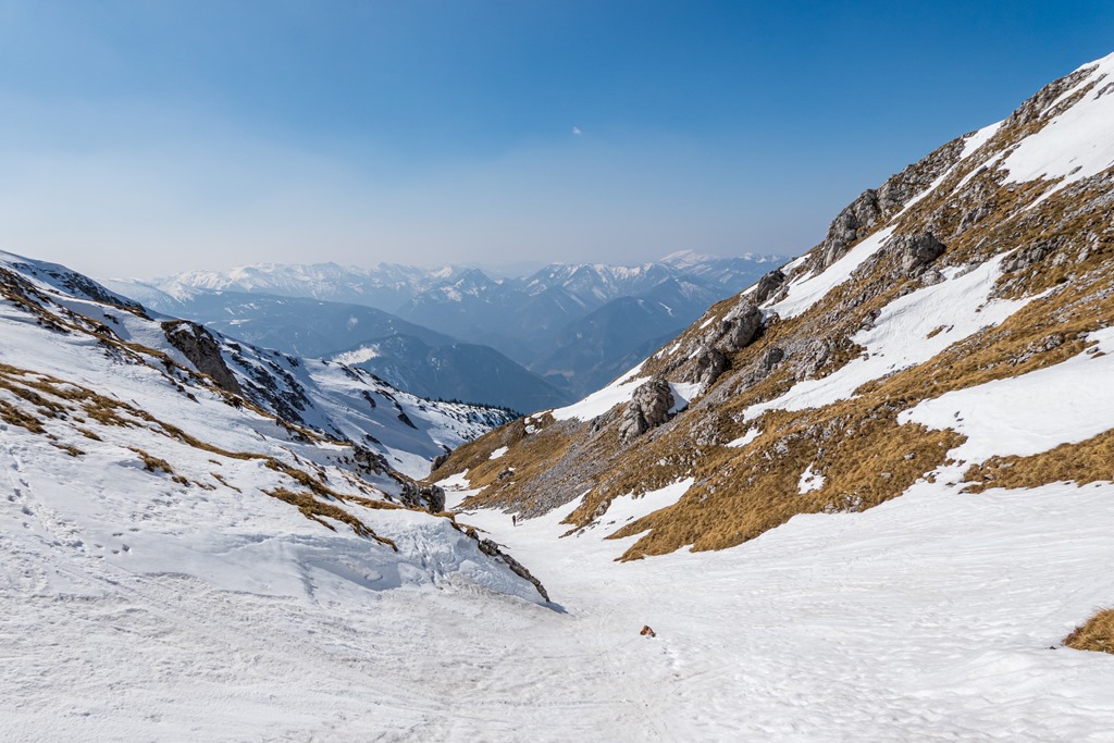 Odafenn aztán, ragyogó napsütés fogad, csendes szellő, ha egyáltalán lebben (10:45). Megválhatunk a bakancsaikra húzott vasaktól. Egyelőre úgy néz ki, felfelé menetben nem is lesz már többé szükség a bevetésükre. Tévedés. A Fadensteigből való kilépés szintjén (1700 m) ugyan olvadozik minden, de ahogy közeledünk a 2000 méteres szint felé, egyre keményebb és csúszósabb a lejtőket borító jég. Így aztán kénytelen-kelletlen ismét felveszem a vascsipkéket.