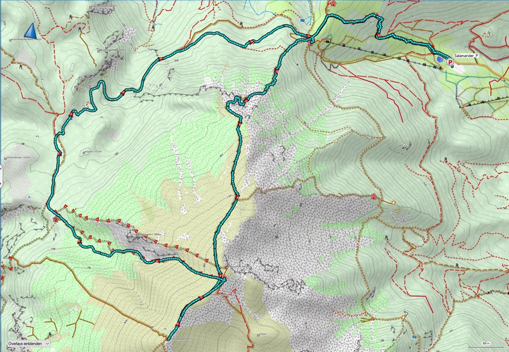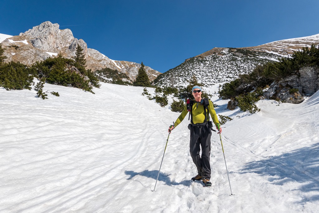 Lefelé a Wurzengrabenben találjuk a legkézenfekvőbbnek alászállni. Szemben sítúrázók érkeznek, egyenként, majd csapatostul. A hóréteg egyelőre jól elbír, csak később a Krempel-Hütte szintjén, a nap melege nyomán, mélyen besüppedünk. Nos, itt, ezen a szakaszon mindenképpen praktikusabb lett volna a hótalpak használata. Ez a kacsázás és küzdelem a mély hóval eltart majdnem az Edelweißhütteig. A széles erdészeti út, téli arculatát mutatja, a hó lejtő-szerűen tölti ki, takarja az út felületét.