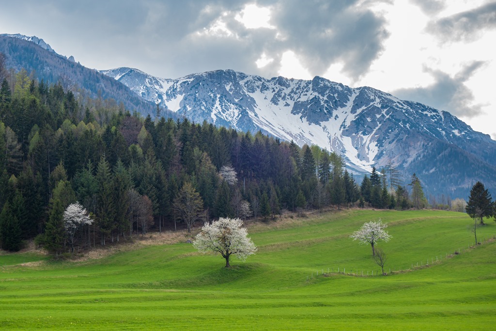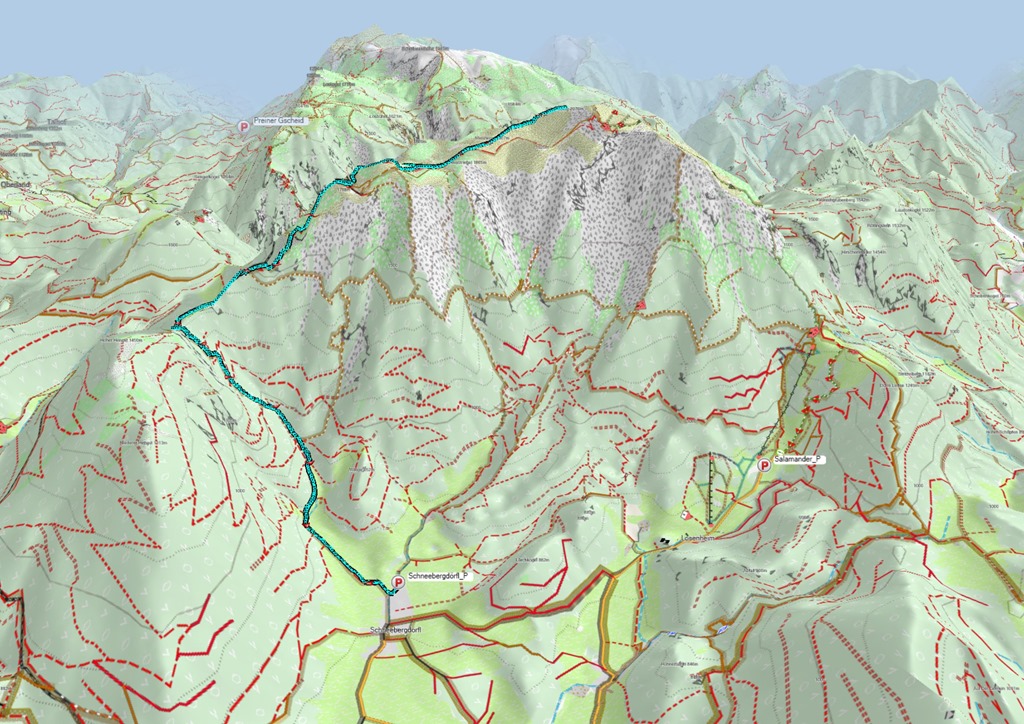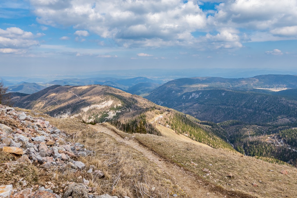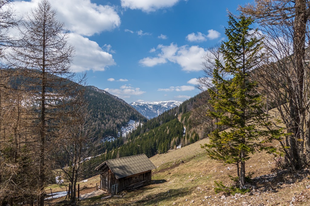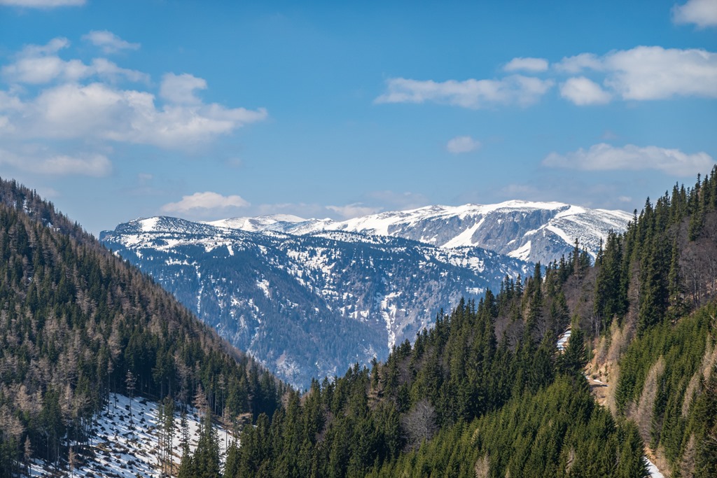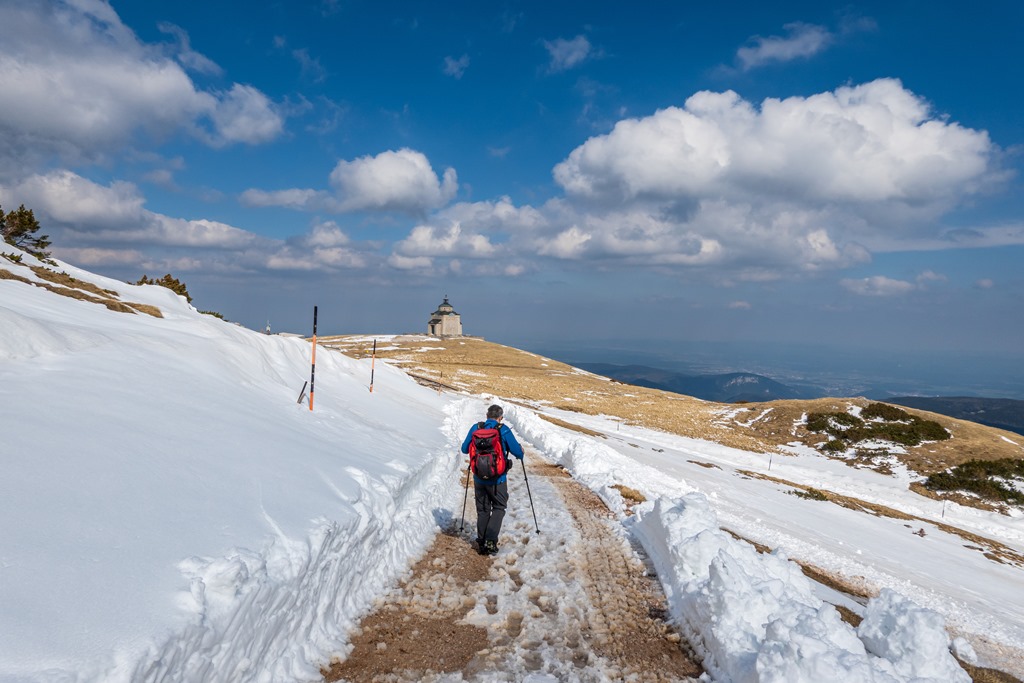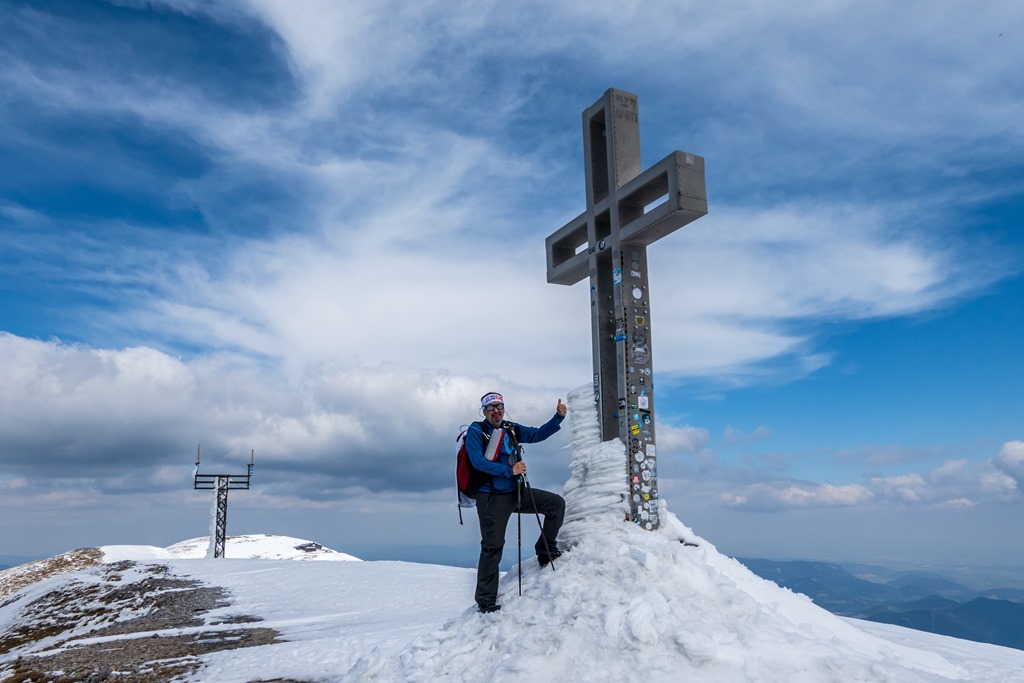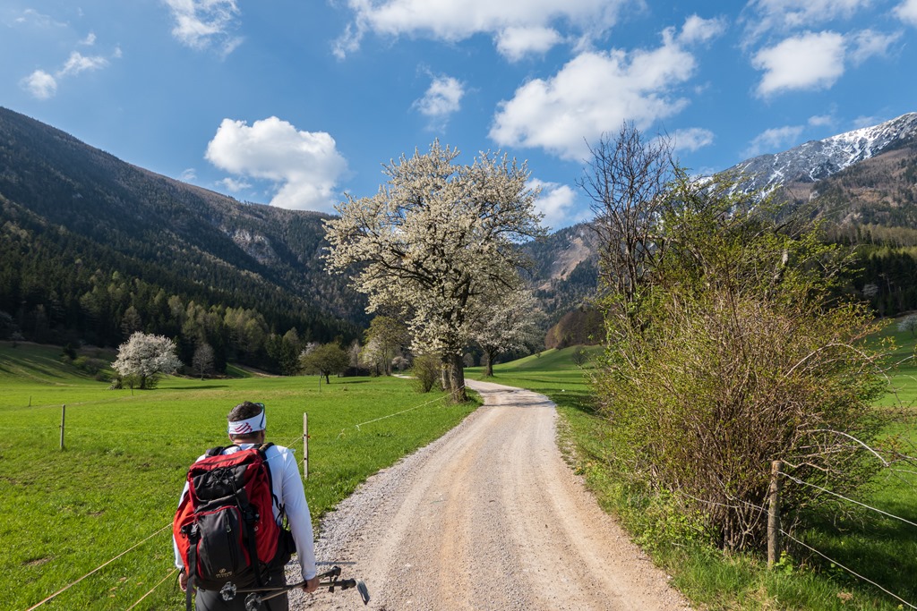 Attila a legutóbbi túránkon odáig volt a Schneeberg panorámájával, és tehát még a nyár beköszönte előtt oda föntre vágyakozott, a tavaszi télbe. Nos, kívánsága számomra parancs. Legyen úgy! Induljunk Schneebergdörflből a Mieseltalon át fel a magaslatokba. Odalenn erőteljesen tombol a tavasz, az idő kellemes, virágzó gyümölcsfák szegélyzik utunkat, így valamelyest nehezemre van a téli szerelés cipelgetése. Mivelhogy a hegy optikája odafönn, még ugyancsak sok fehérséget reklámoz.