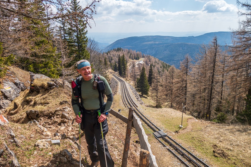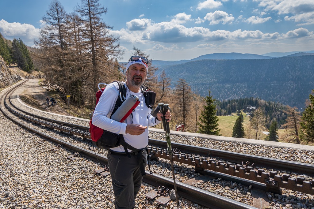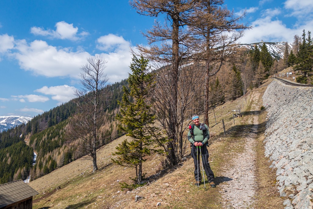 Fél tíz lehet, amikor elindulunk. Először csak egy széles erdészeti úton poroszkálunk majd egy patakon átkelve bekeményedik a terep és nekikunkorodik a magaslatoknak. 10:00 órára érkezünk a Szalamandra vasút vonalához, a nyeregbe, ahol jobbra fordulunk Baumgartner állomás felé. A kisvasutasok már serénykednek. Holnap indul a szezon, van elég dolguk az előkészítéssel.