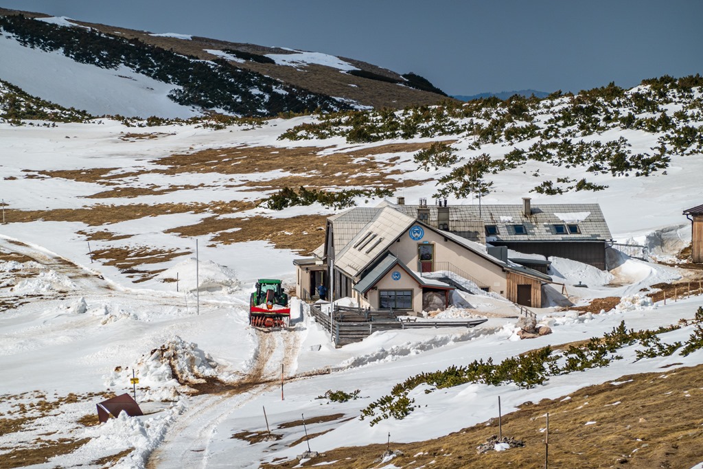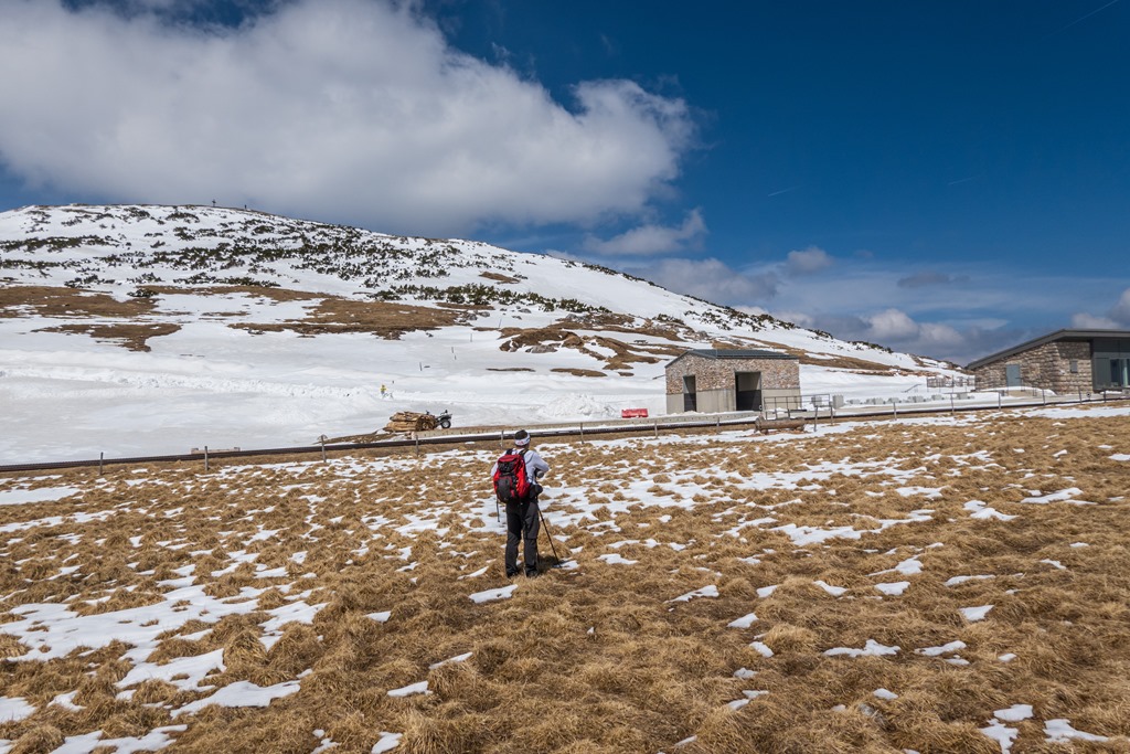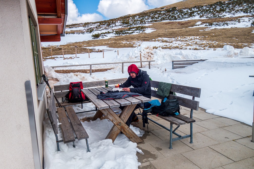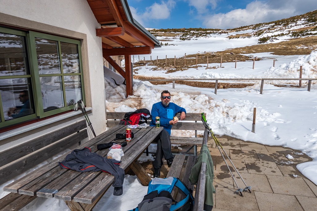 A Fischerhütteig most nem megyünk el, mert nem lehet tudni, hogy alatta milyenek a hó-viszonyok. Semmi kedvem esetleg kényszerűen visszaballagni, hogy ugyanott érkezzünk le, ahol felkapaszkodtunk. Déli ebédszünetünket ezen okból a Damböckhuas napsütötte teraszára helyezzük (13:50). Ez egy jó választás. Igaz, amikor felhők takarják el a napot, máris érződik a hegy jeges lehelete. Később meg aztán olvadozunk a nap hevétől.