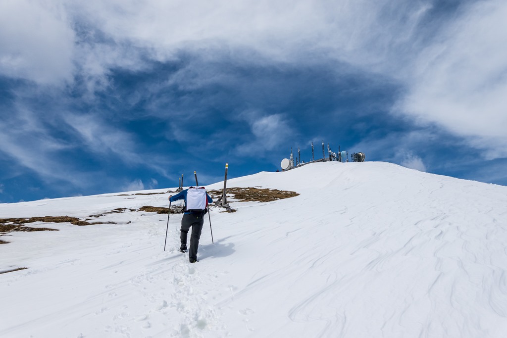 A kásás hóban való baktatás, beszakadás, az alul megbúvó jeges rétegen való ki-kicsúszásokkal tarkított menetelés azért nagyon kiveszi az ember spikkjét. Úgy elcsigáz a dolog monotóniája, hogy ijesztem Attilát, lehet nem bírom a tempót a csúcsig. Tényleg úgy érzem a limiten vagyok, és még el sem kezdtük az utolsó, legmeredekebb 200 m szint leküzdésével járó végső csúcsostromot.