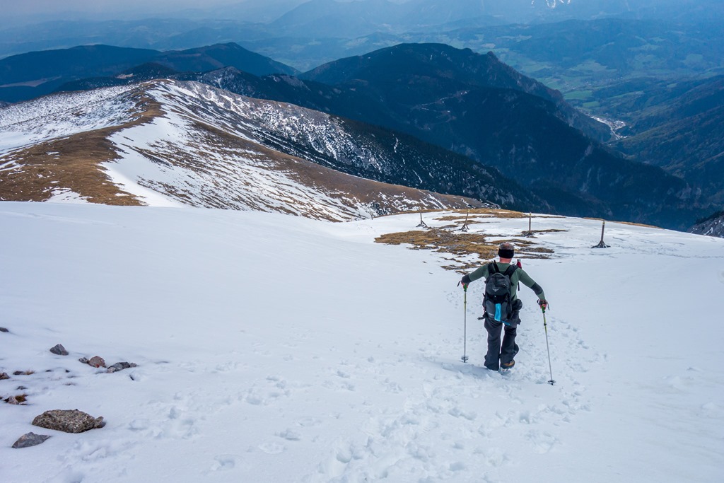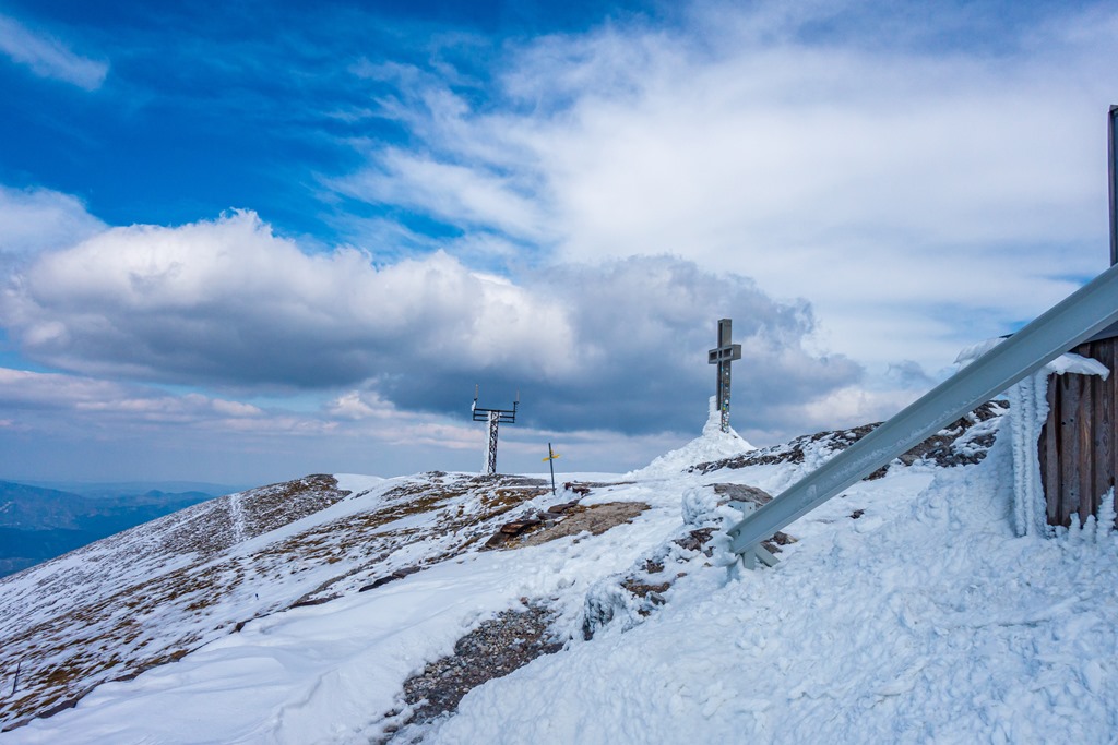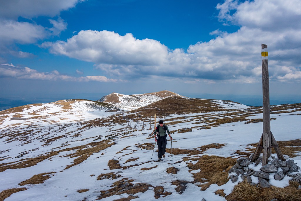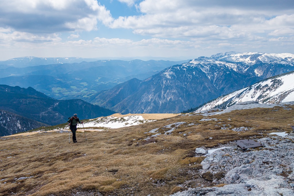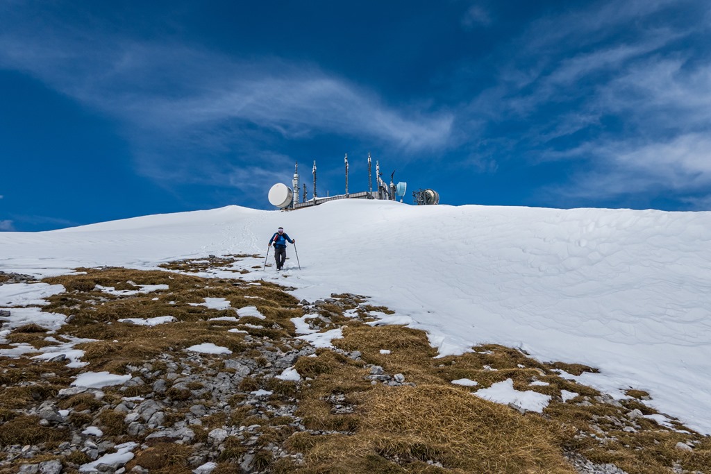 Elnézünk tehát a Damböckhaus felé, hátha a déli, napsütötte oldal kedvezőbb feltételeket biztosít. És valóban. Itt a hótakaró szaggatott, gyakorlatilag száraz lábbal érünk fel a csúcsra (11:35). Közben kétségeink támadnak, hogy vajon képesek leszünk-e bevenni a Klosterwappent. Na, nézzük meg, próbálkozzunk. Ha nem megy, mindig vissza lehet fordulni. Attila ezt nem szívesen hallja, én sem szívesen gondolok ilyesmire, de megengedem.