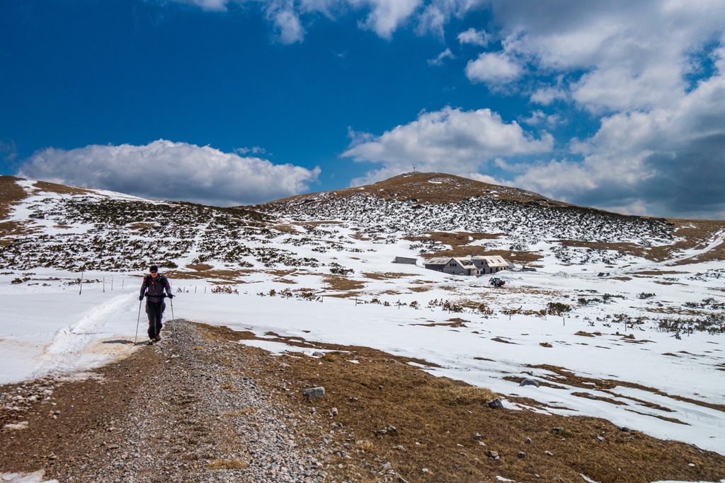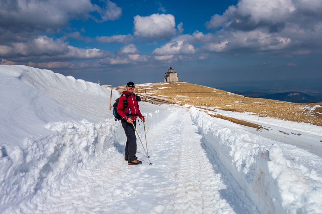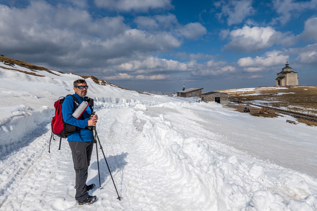 Következik a második szakasz, az Erzsébet kápolnáig történő kaptatás. Nos, itt már találkozunk szép széles, de ugyancsak izzadó hómezőkkel. Helyenként sárban tocsogunk, olvadozó hó táplálta patakok csörgedeznek az ösvényen. Nem lehet tudni, hogy az agyagon csúszunk-e majd ki, avagy a hókásán.