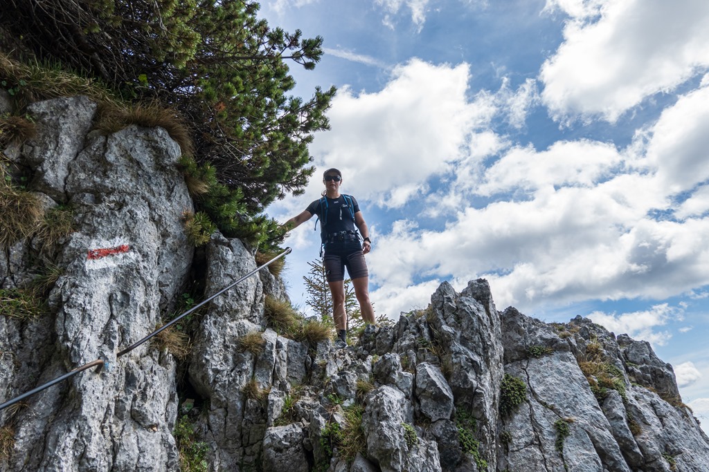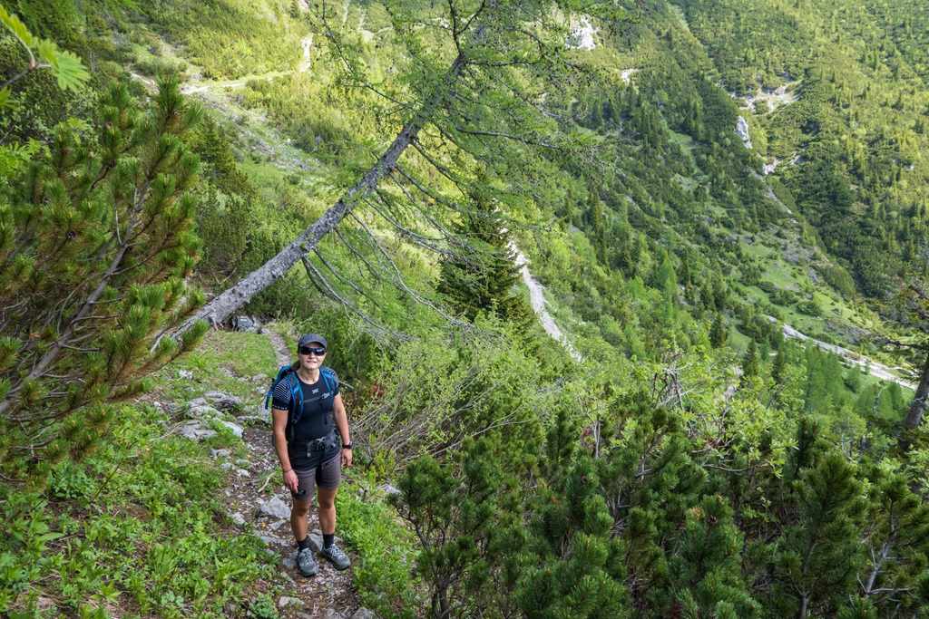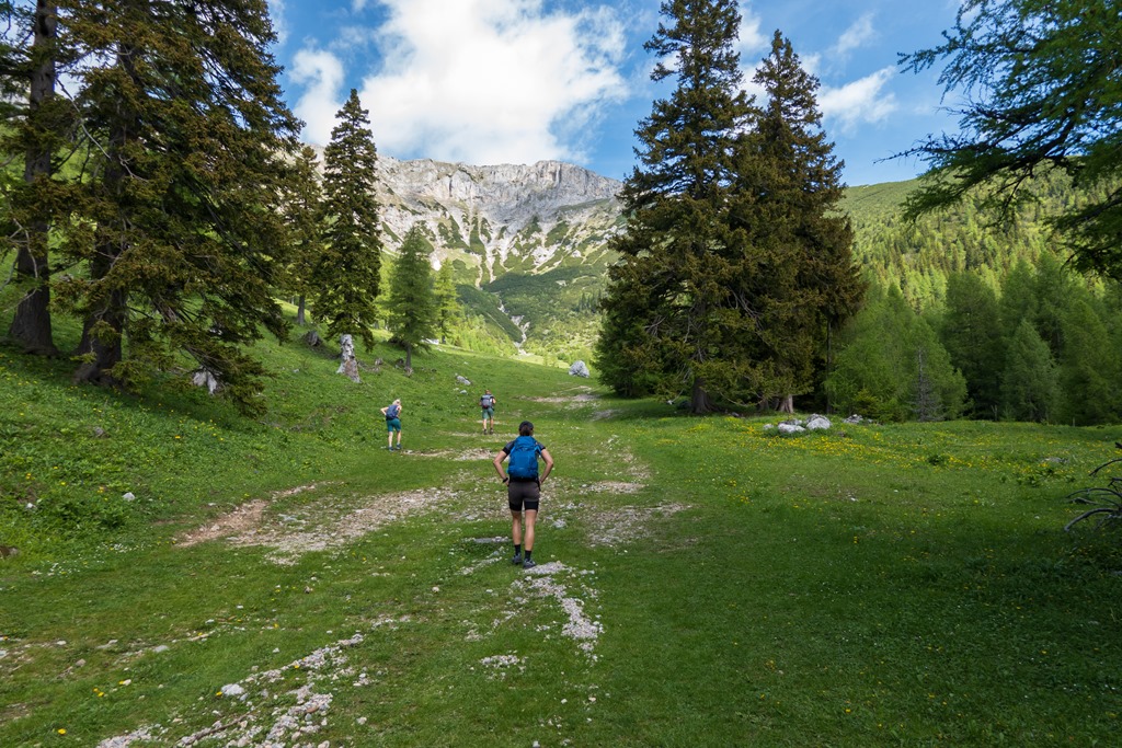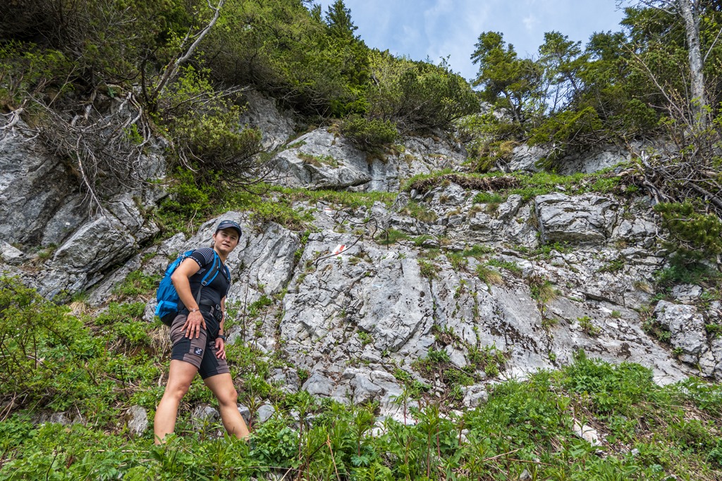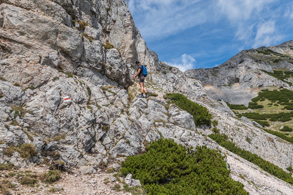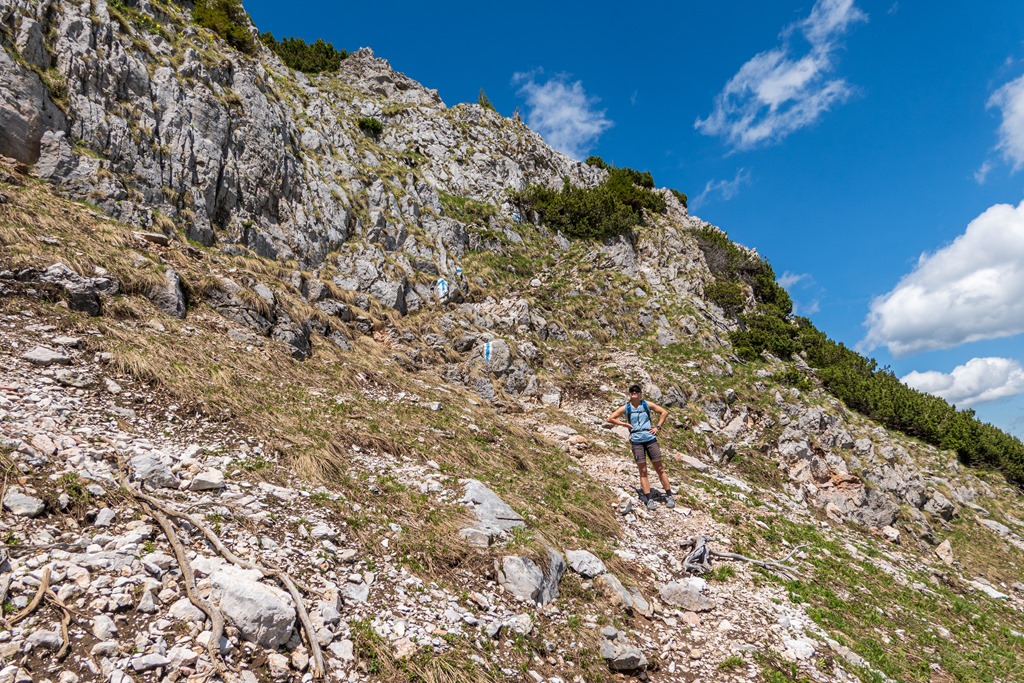 Cirka félórás ebédszünetünk után az említett Raxenmäersteig van porondon. Egy jó meredek, drótkötéllel is biztosított szakasz után teljesen beszelídül a terep. Az ösvény a Kontrussteigbe torkollik (14:25), majd onnan lazán vissza Preiner Gscheidbe.