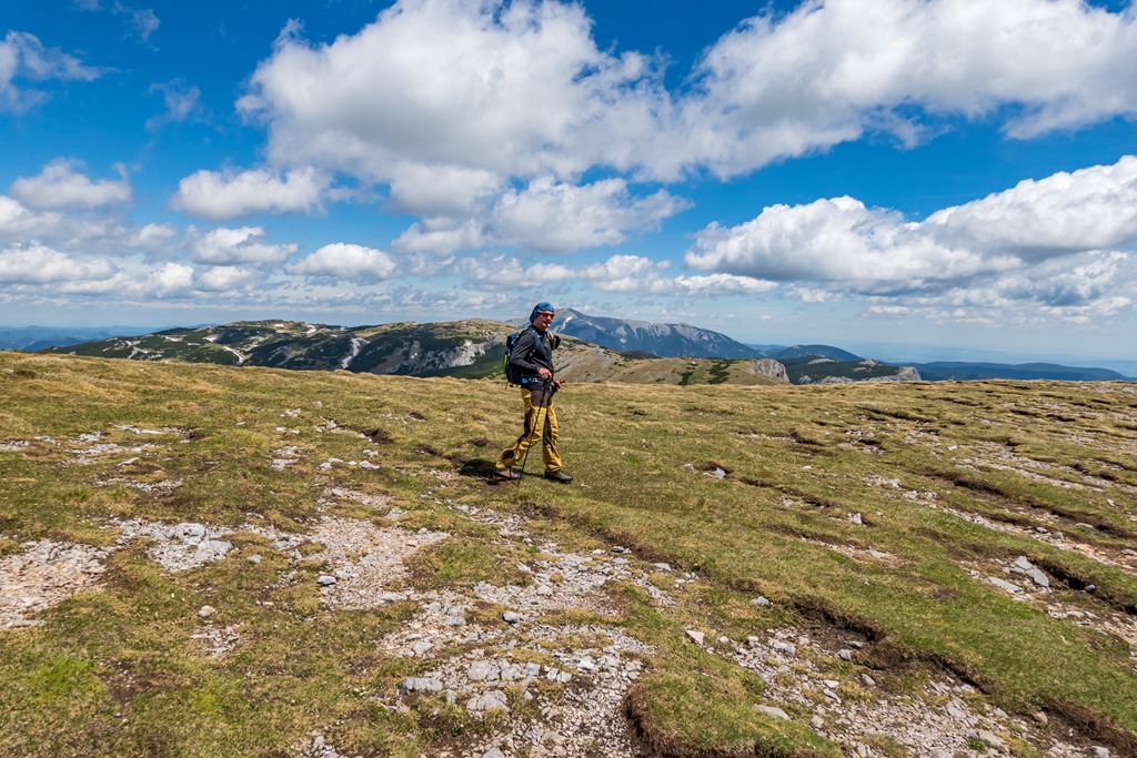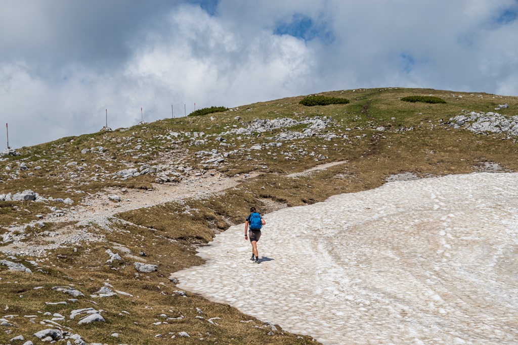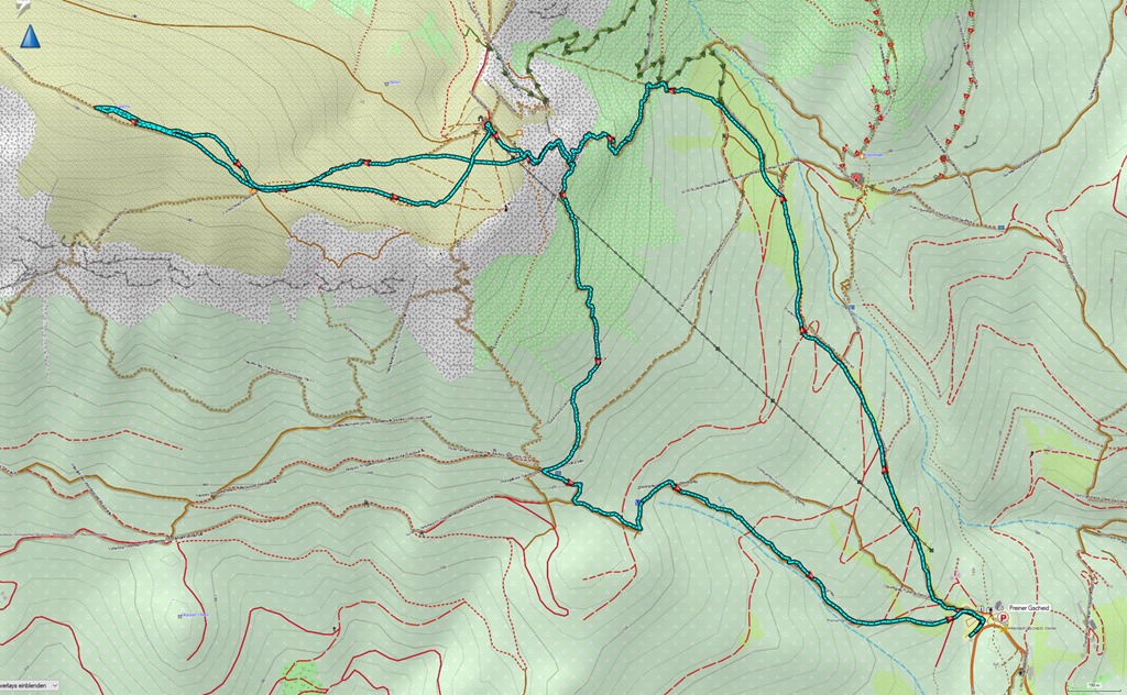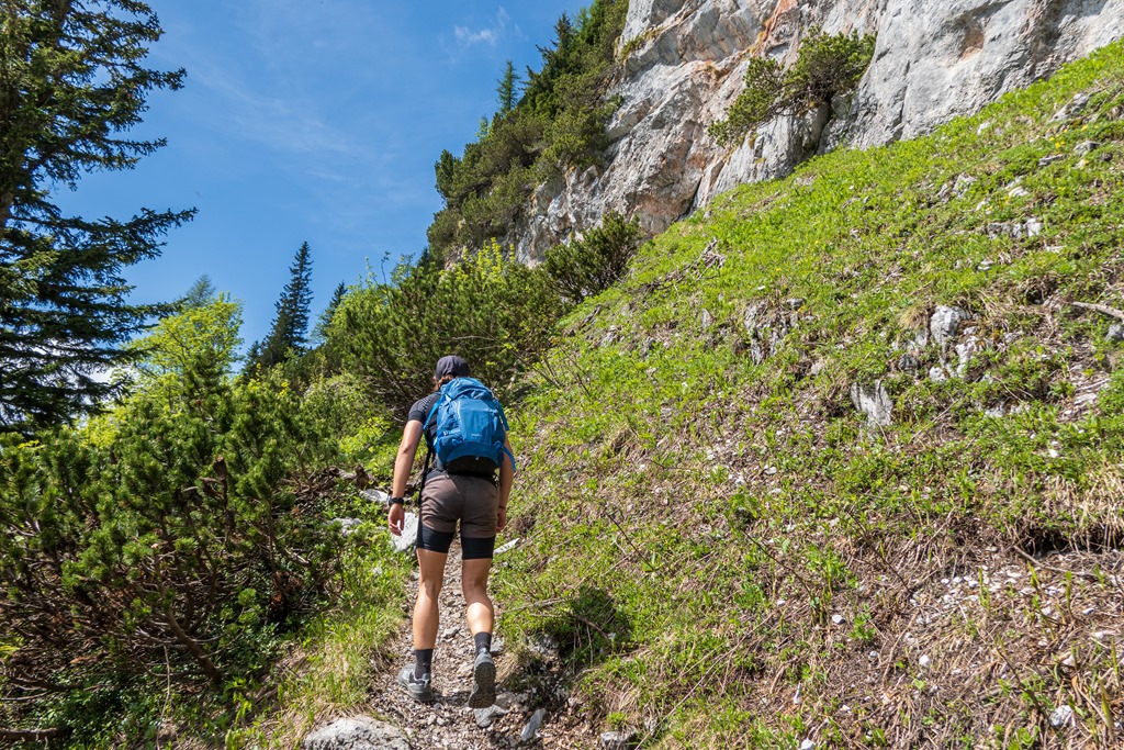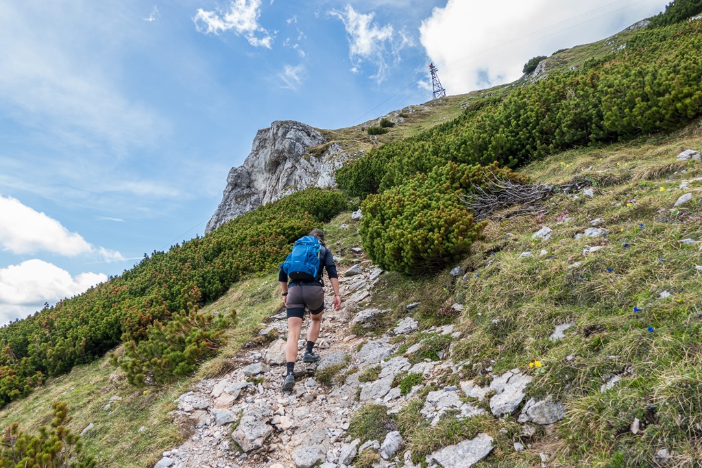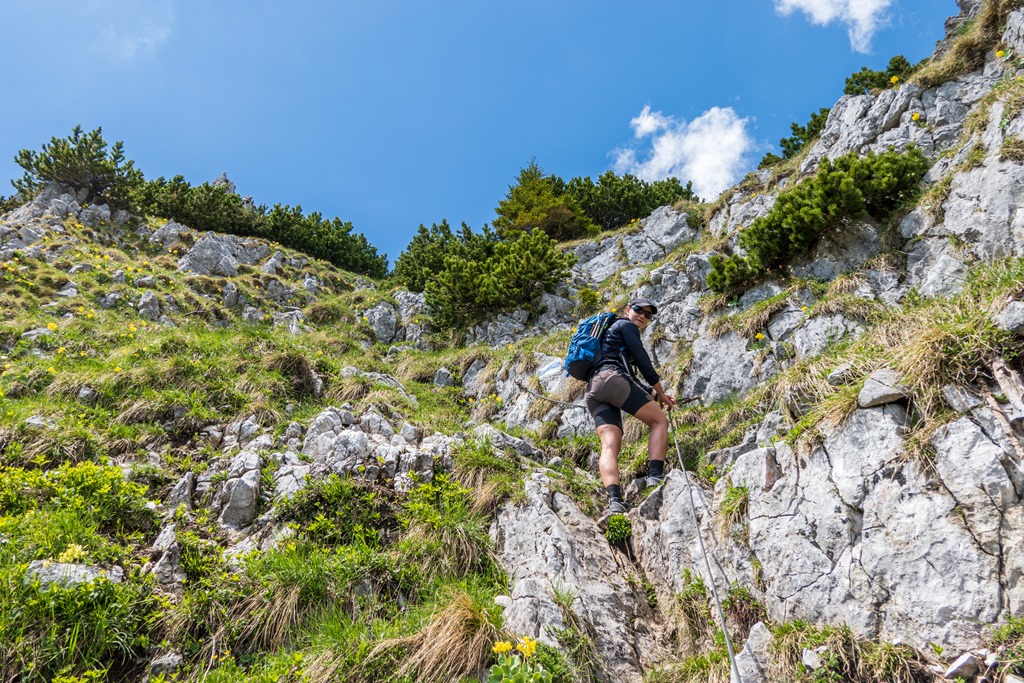 Cirka félórás ebédszünetünk után az említett Raxenmäersteig van porondon. Egy jó meredek, drótkötéllel is biztosított szakasz után teljesen beszelídül a terep. Az ösvény a Kontrussteigbe torkollik (14:25), majd onnan lazán vissza Preiner Gscheidbe.
