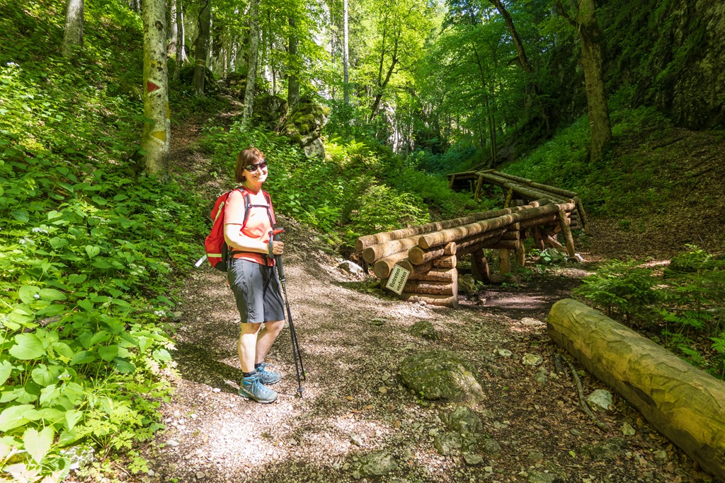 Talán már a korábbi beszámolókban elmondtam, hogy az elmúlt századokban itt intenzív fakitermelés volt folyamatban. Az Engen át, speciell erre a célra épített csúszdán (a németben ún. Riess) csúsztatták le a kivágott törzseket a völgybe. Az eredetinek még itt-ott fellelhető egy-egy teljesen elkorhadt darabkája, de dolgos kezek, a régi mintájára szerkesztettek ide egy szakasznyi afféle igazinak látszó modellt, eredeti méretben.