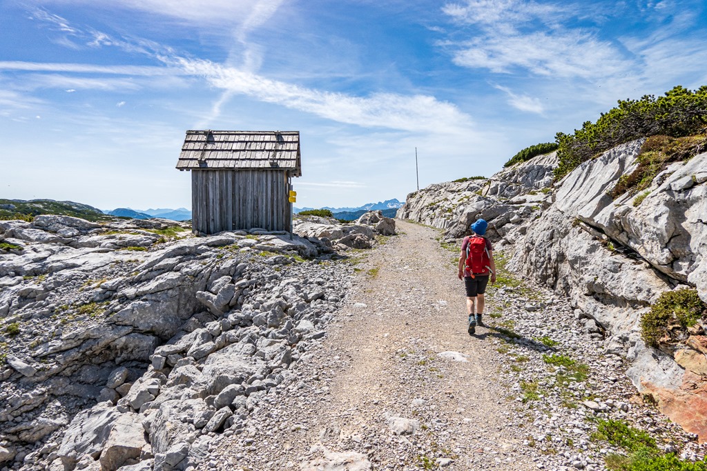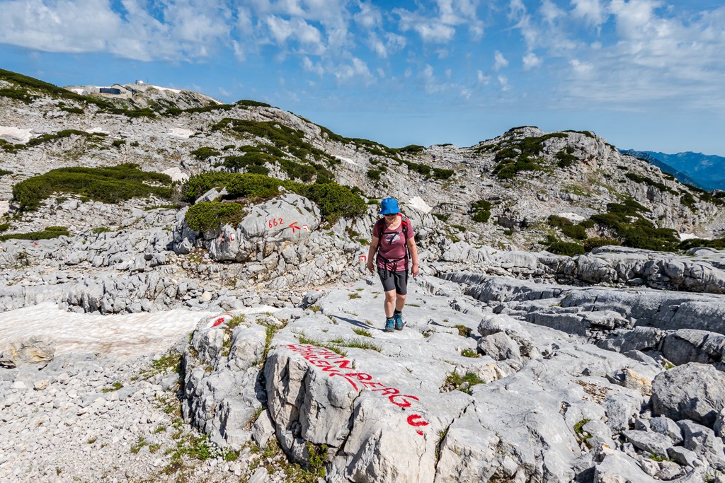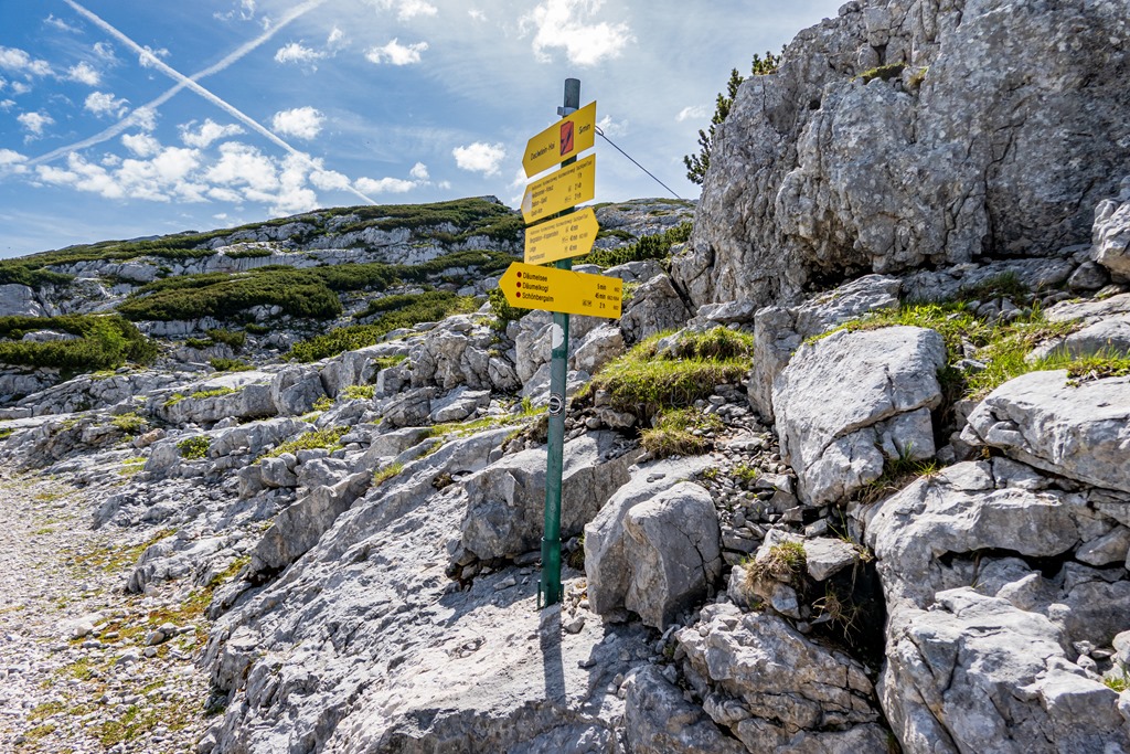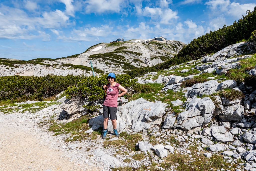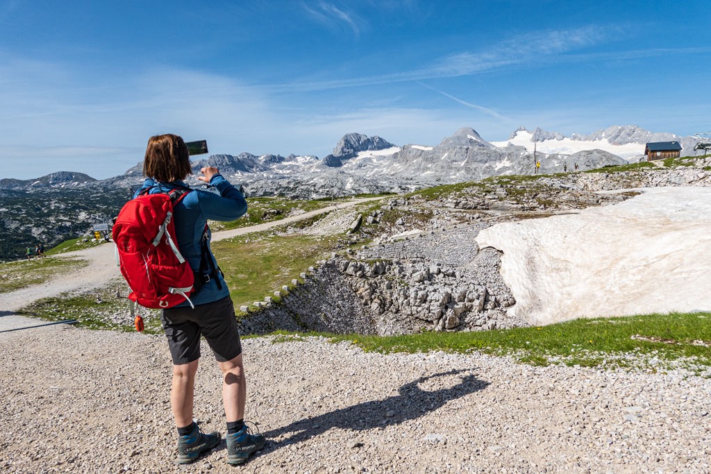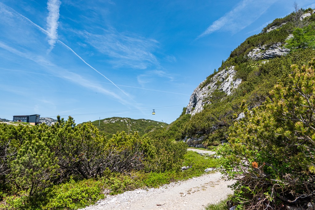 A Krippenstein nagykabinos kötélpálya három szakaszból áll. Az első, 600 m szintről repít fel az 1350 méteren fekvő Schönbergalmra. Az érdeklődök itt mindjárt ki is szállhatnak, hogy megtekintsék a jég- és a mamut-barlangokat. Mi Angikával per pillanat, ezekben a csodákban nem vagyunk érdekeltek, és így egyszerűen csak átszállunk a második szakaszra, mely cirka 2100 méterre, a Hoher Krippenstein alá emeli a kabin utasait.